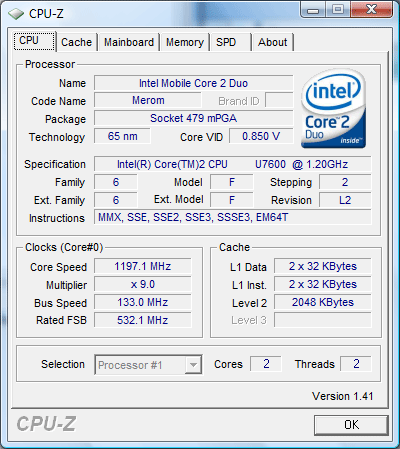 Весьма любопытная конфигурация. Начнем с процессора. Внутри R500 на благо своего хозяина трудится чип Intel Core 2 Duo U7600. Это специальная ULV-версия с TDP 10 Вт. Данный ЦП был представлен Intel весной этого года, поэтому относится к последнему поколению мобильных процессоров. Его тактовая частота составляет 1,2 ГГц, размер кэш-памяти второго уровня — 2 Мбайта, а системная шина — 533 МГц. Для работы в офисных приложениях, просмотра фильмов, серфинга в интернете и тому подобных задач его мощности хватит с лихвой.