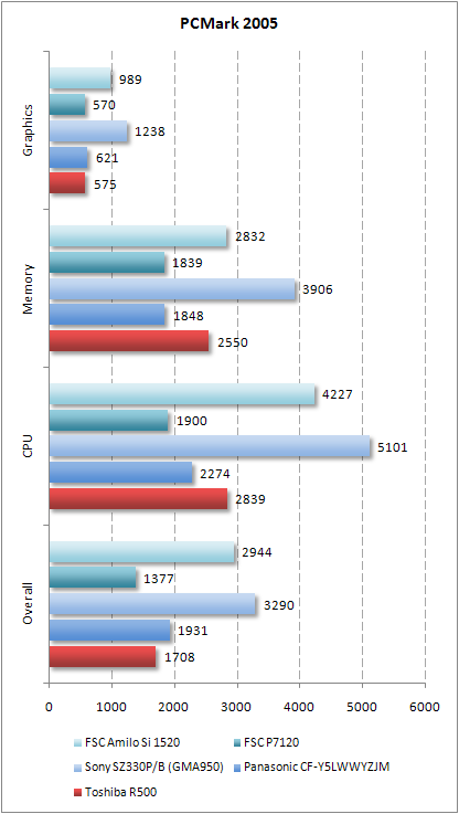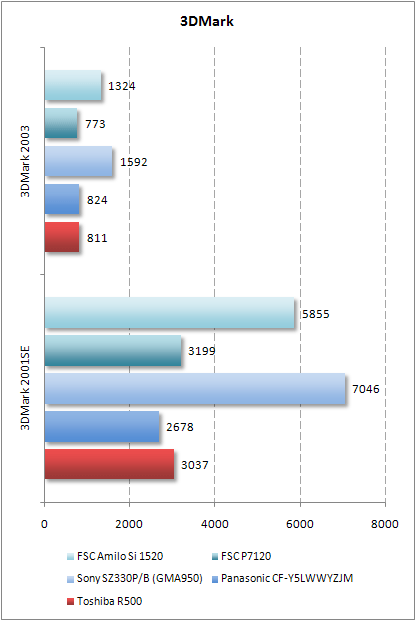 В PCMark 2005 ноутбук R500 показал практически самый низкий результат, немного опередив P7120. Впрочем, его победа над бизнес-ноутбуком Fujitsu Siemens позапрошлого поколения вполне ожидаема. А вот с графикой у Toshiba что-то не заладилось. Встроенное ядро GMA950 на мизерные единицы быстрее GMA900, которое установлено в P7120. Все остальные ноутбуки оказались ощутимо быстрее.