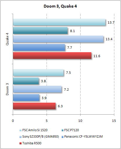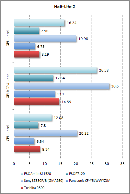 С играми Toshiba R500 справился лучше. В Doom 3 и Quake 4 он незначительно отстал от Sony SZ330 и FSC AMILO Si 1520, основанных на более быстрых ЦП. В Half-Life 2 ноутбук Toshiba идет почти вровень с CF-Y5 и P7120, тогда как два других компьютера сильно вырвались вперед. Эта игра более чувствительна к скорости процессора.
