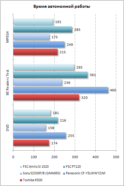 В плане автономной работы R500 показал весьма достойный результат, уступив только P7120 и CF-Y5. Впрочем, эти два ноутбука являются нашими рекордсменами, поэтому третье место, которое осталось за рассматриваемой моделью, весьма почетно. Toshiba R500 работает более 5 часов в режиме чтения, около трех часов в режиме просмотра DVD и три с половиной часа в режиме воспроизведения MPEG4 с жесткого диска. Этого вполне достаточно, чтобы поработать и провести досуг.