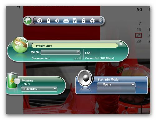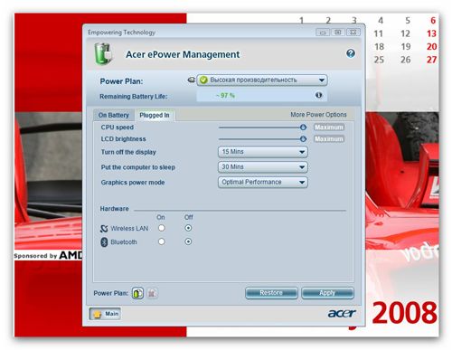 Признаюсь честно, давненько мне не встречалось столько предустановленных фирменных утилит от производителя. В последнее время компании не комплектуют ноутбуки Recovery-дисками. Такая тенденция хорошо заметна на примере моделей от Samsung и HP, где функция восстановления ложится на «плечи» предустановленного софта, а все необходимые файлы хранятся в защищенном разделе жесткого диска. Подобное решение применяется и в Acer Ferrari 1100. В случае сбоя утилита eRecovery поможет вернуть все на свои места. Также с помощью нее можно создавать образ своей системы, чтобы после восстановления не приходилось заново устанавливать многочисленное любимое ПО.