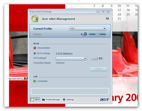 Ferrari 1100 оснащен отличным Wi-Fi-модулем производства Broadcom. Что любопытно, он поддерживает новый стандарт «n», в связи с чем скорость передачи данных значительно возрастает. Модуль цепко держит сеть с помощью фирменной технологии Acer SignalUp. Настроить соединение поможет фирменная утилита eNet Management.