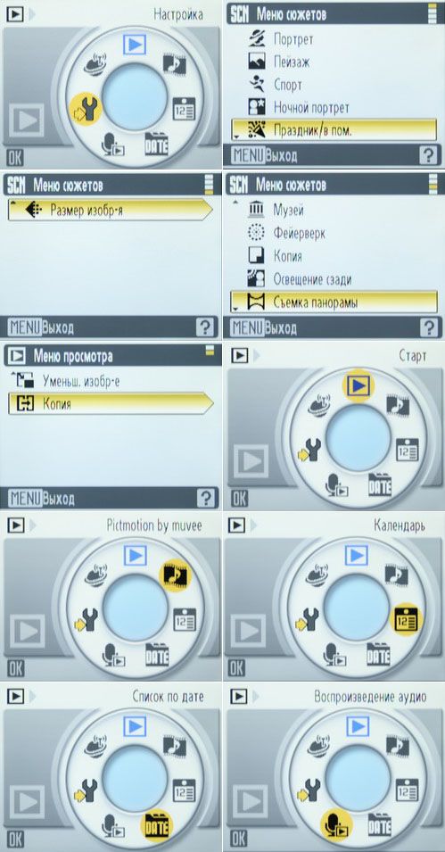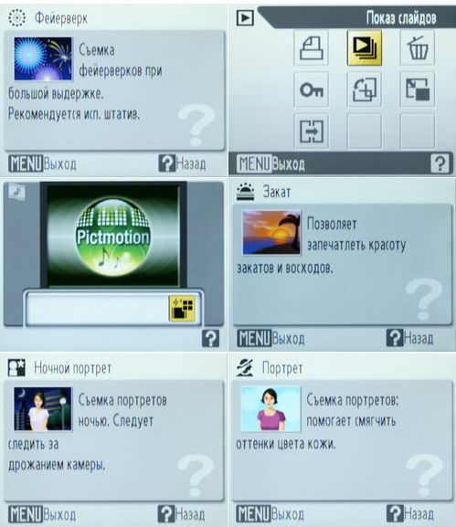Меню легко в освоении: отображается в виде кольца с нужными позициями: настройки, видео, запись видео и голоса, обычная съемка, съемка с высокой чувствительностью, сюжетные программы (15). Снимки, в зависимости от даты съемки, отображаются анимированным потоком. Есть возможность просматривать иконками по 3, 4 или же 5 элементов в ряду, просматривать по дате съемки.