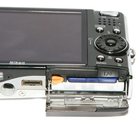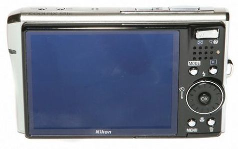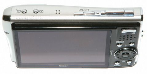 Coolpix S51c компактен, в первую очередь это достигнуто за счет внутреннего зумирования: габариты не изменяются, выступающих частей нет. Объектив прикрывается пластиковой шторкой из такого же серебристого пластика, отверстие обрамлено прямоугольной пластиковой стилизованной под металл декоративной рамочкой.