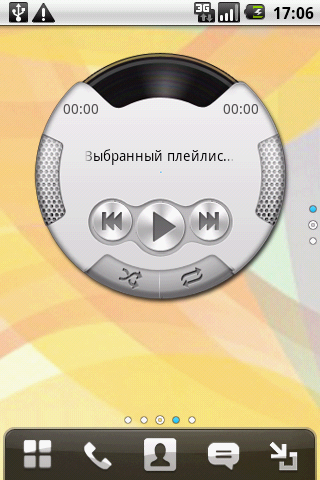 Более интересным является аудиовиджет, которого вполне достаточно для управления воспроизведением. Он оформлен в виде диска, по центру размещены виртуальные клавиши управления и название текущей дорожки, в верхней части отображается прогресс воспроизведения, а в нижней доступны параметры (режимы перемешивания и повтора).