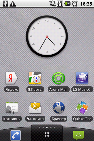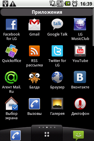 Как и другие производители, компания LG приложила определенные усилия для персонализации стандартной оболочки ОС Android. Разработчики предложили альтернативное оформление рабочего стола и главного меню. Изменения, честно говоря, вносят лишь второстепенные штрихи. К примеру, на главных экранах закрепляется трей из четырех иконок с основными, телефонными приложениями: окно набора номера, контакты, сообщения, а также клавиша входа в главное меню. Последнее, в свою очередь, представлено уже не единым списком, а разделено на две части. Сначала отображаются только предустановленные утилиты, далее следует блок программ, установленных пользователем. Удобно, что за переключение между фирменным и стандартным интерфейсом отвечает отдельное приложение, т. е. вернуться к другому способу отображения можно буквально нажатием одной клавиши.