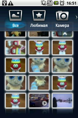 Для просмотра фотографий и видеороликов имеется несколько модифицированная «Галерея», с дополнительными ярлыками в верхней части экрана. Они позволяют быстро перейти к снимкам, сделанным при помощи встроенной камеры, или избранным изображениям. Имеющиеся в памяти устройства картинки отсортированы в хронологическом порядке, сбоку прорисована ненавязчивая шкала времени, по которой можно быстро прокручивать ленту фотографий. Изображения также можно разделить по месяцам: снимки, сделанные в одном месяце, подсвечиваются в общем списке.