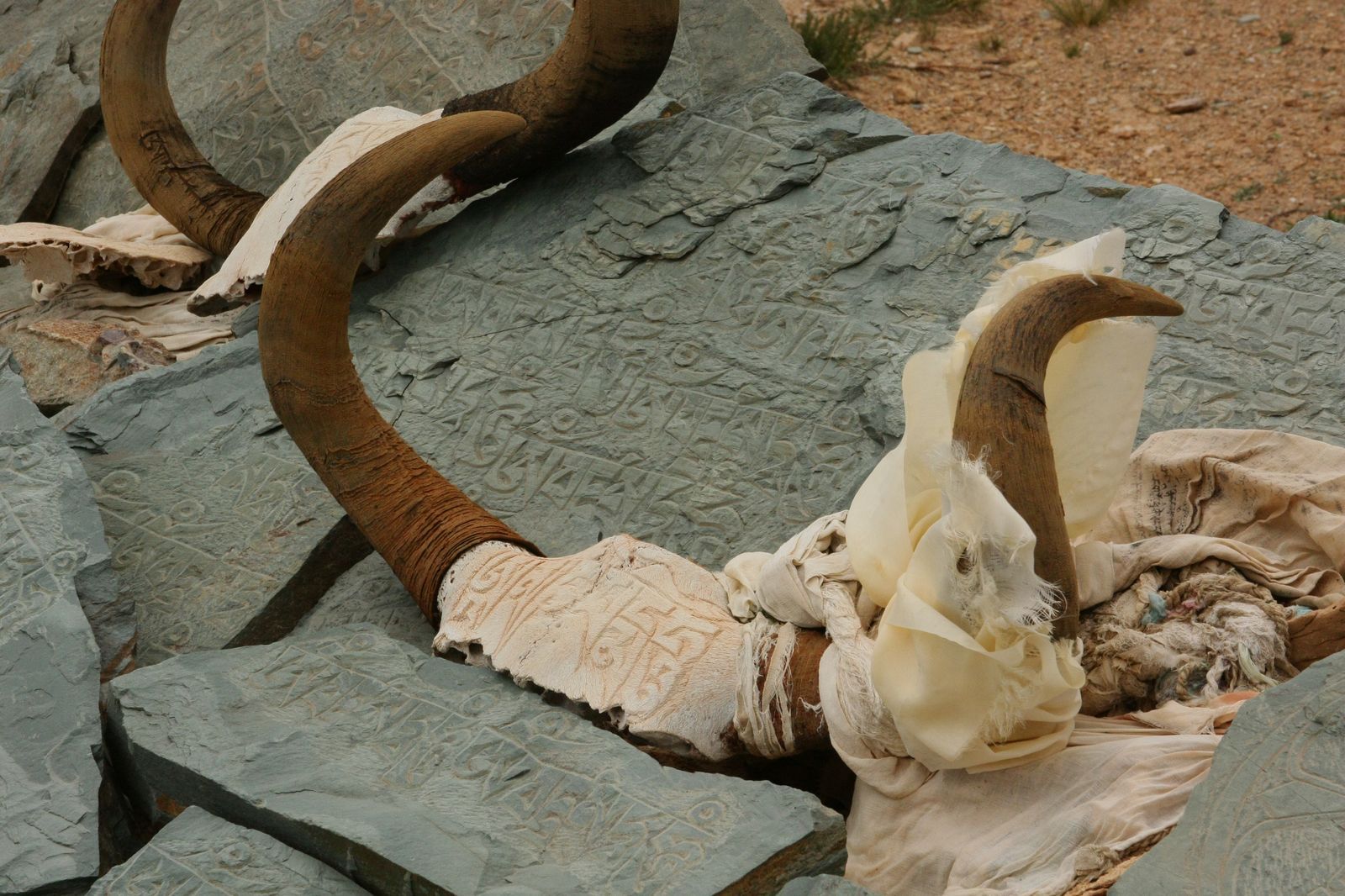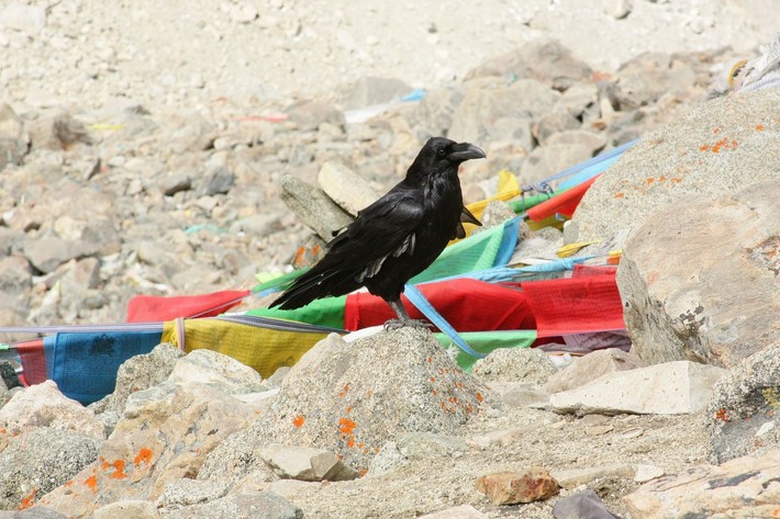 Согласно буддистским представлениям, ветер, развевая флажки, уносит молитвы к небу. На поверхности глыбы, как бы нарисованный самой природой, — священный знак буддистов и индуистов Ом. Важная примета на перевале — появление черного ворона. Если птица мирно приземляется, то остаток пути должен пройти без затруднений.