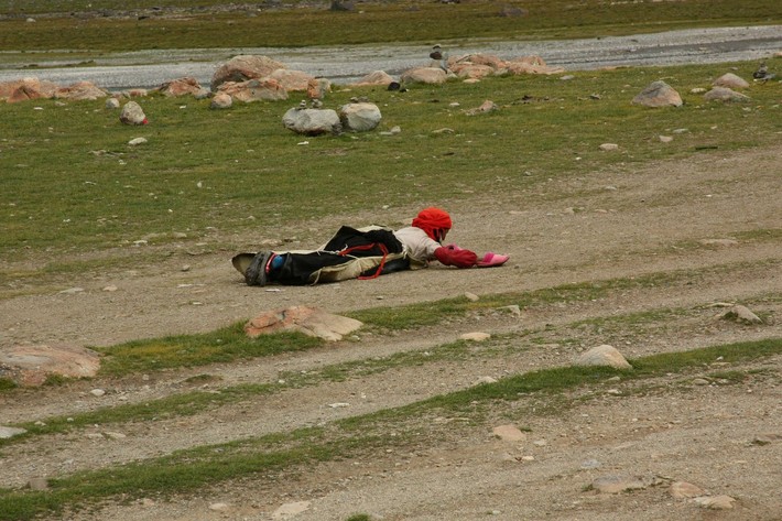 Некоторые буддистские верующие делают ритуальный обход с простираниями, с земными поклонами. Чтобы на очень длинном пути не стирать руки и колени, на руки они надевают обувь, а колени защищают накидкой из крепкого материала. И если мы этот путь проходим за 3 дня, то те, кто совершает простирания, — за 15—20.