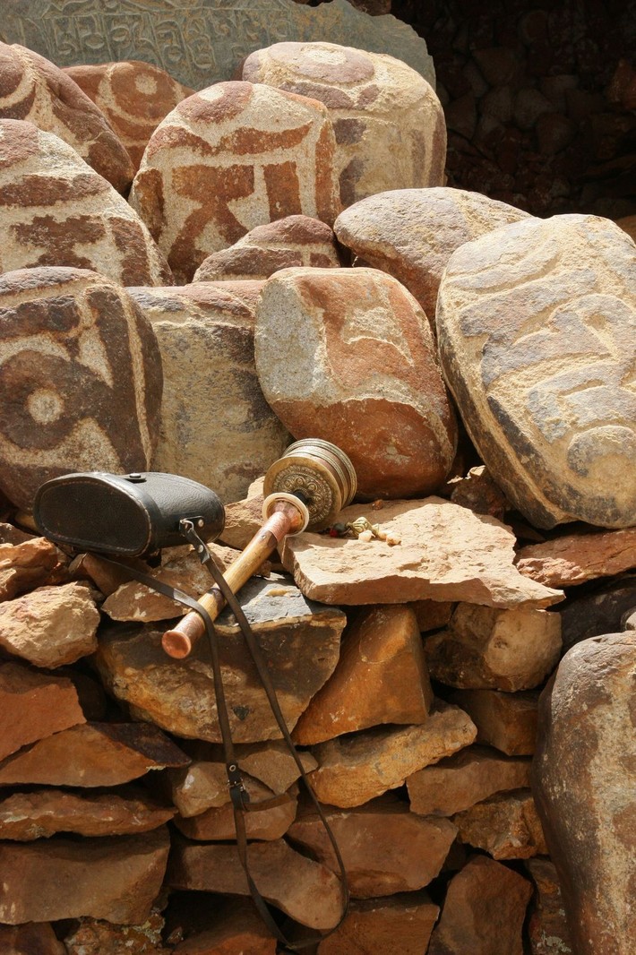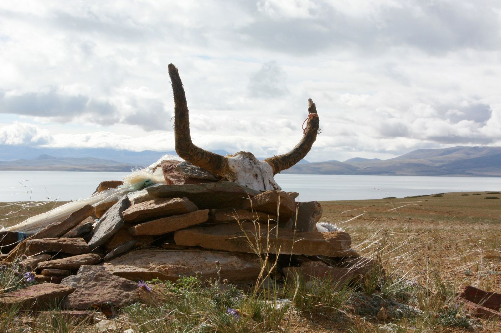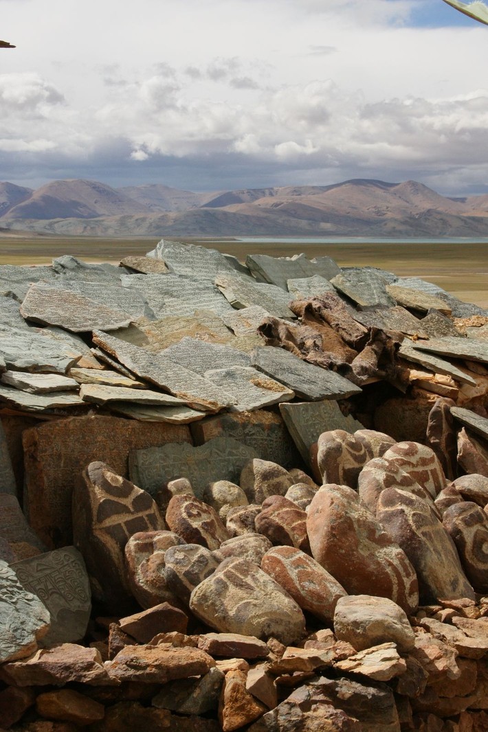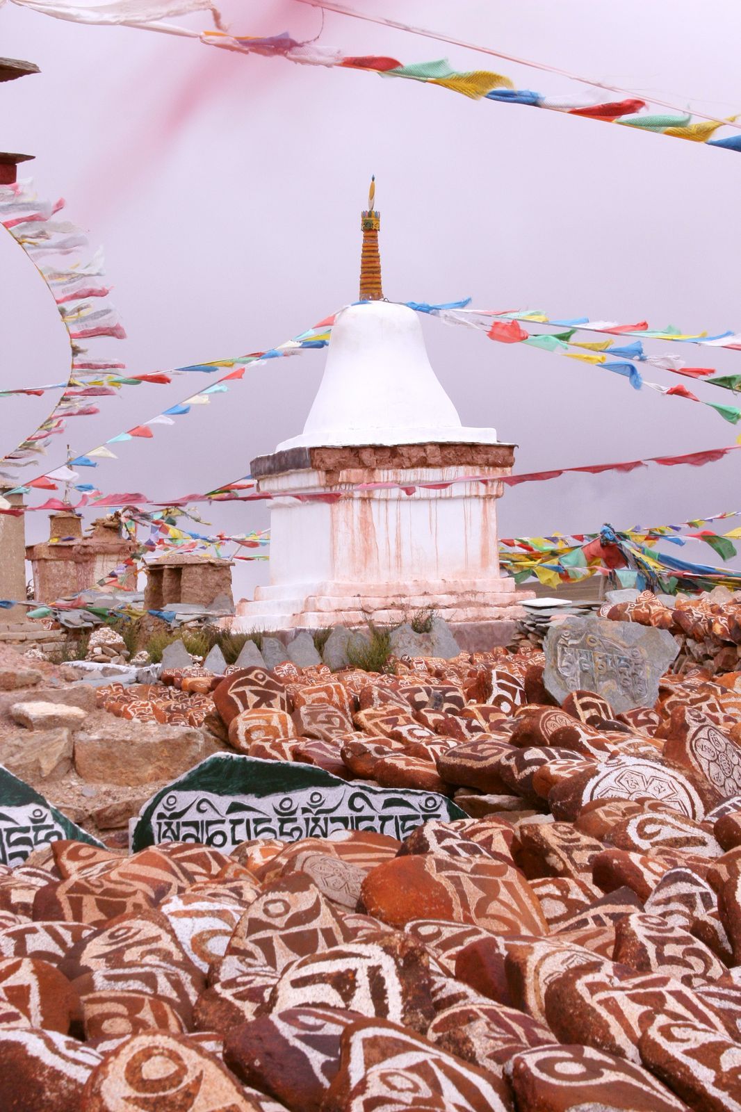 На нем собраны в пирамиду меньшие камни, которые поддерживают флагшток. От вершины последнего отходят многочисленные растяжки с сутрами (молитвами).