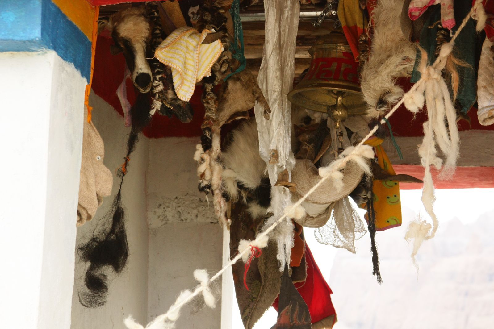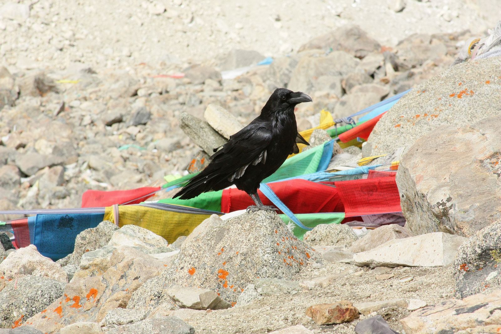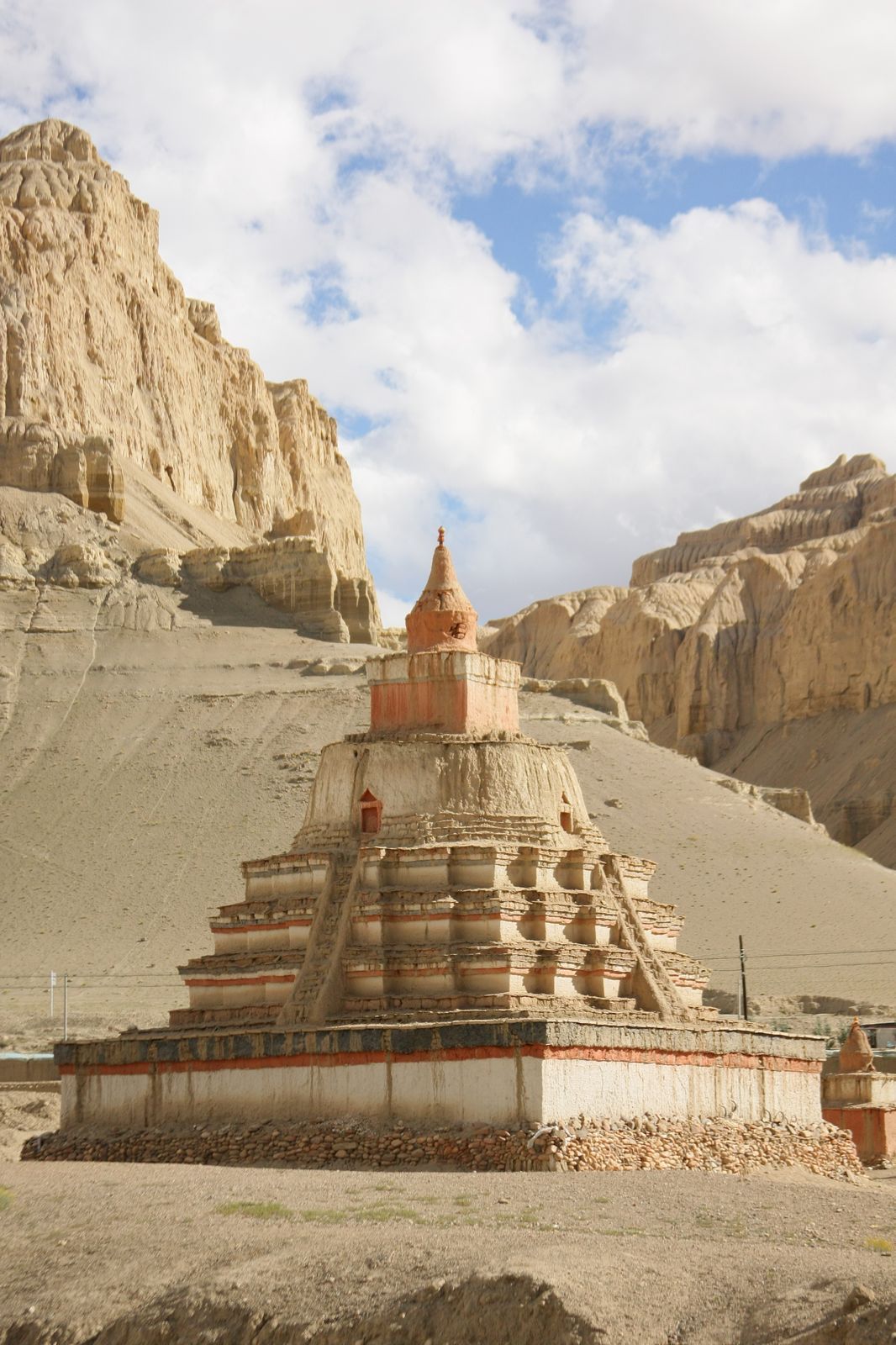 На нем собраны в пирамиду меньшие камни, которые поддерживают флагшток. От вершины последнего отходят многочисленные растяжки с сутрами (молитвами).