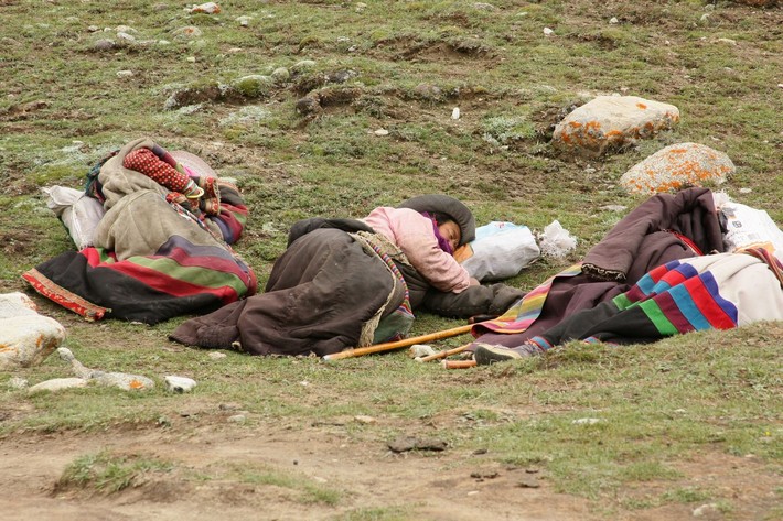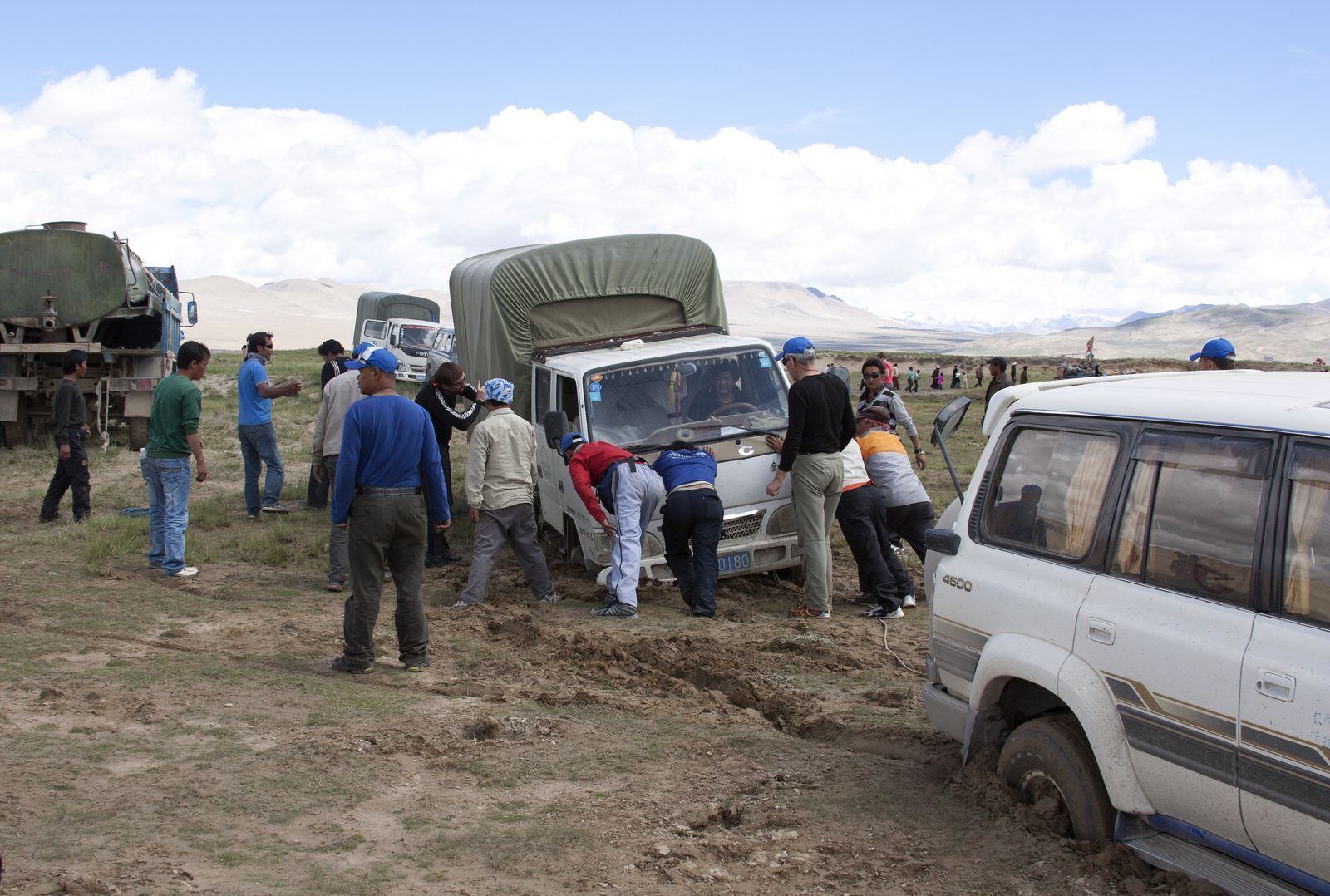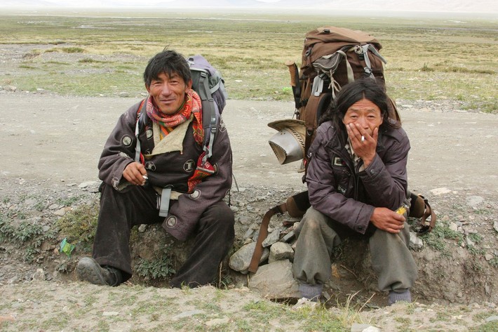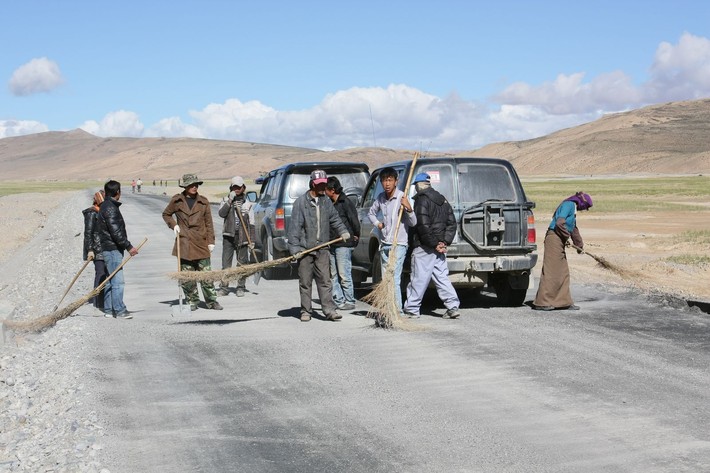 Тибет сегодня — это бесконечные военные базы и постоянные армейские блокпосты со шлагбаумами на дорогах. Сами дороги строятся быстро, руками местного населения. Техники минимум, в основном я видел работающих мужчин, женщин и даже детей. Строительством руководят военные китайской армии. Строящиеся «хайвеи» до официального открытия являются «неприкасаемыми». Многочисленные джипы туристов и транзитные грузовики вынуждены пробираться по пересеченной местности, по рекам и даже по болотам. Приходилось и нам застревать, чтоб потом своими руками выталкивать машины из грязи.