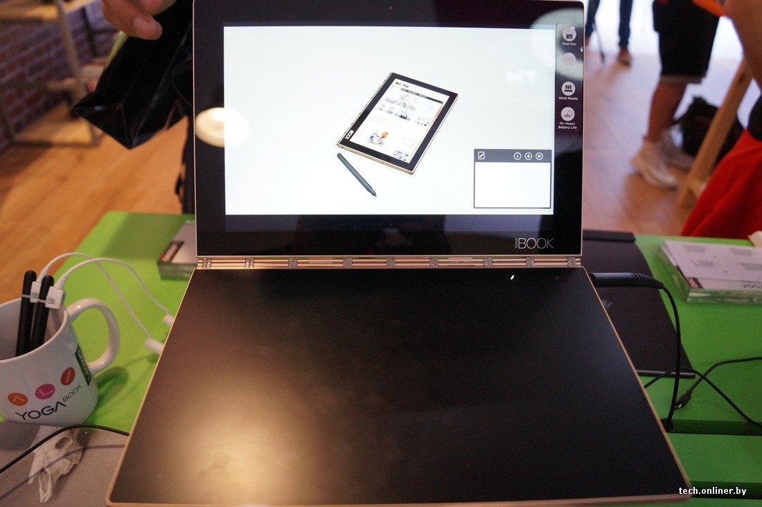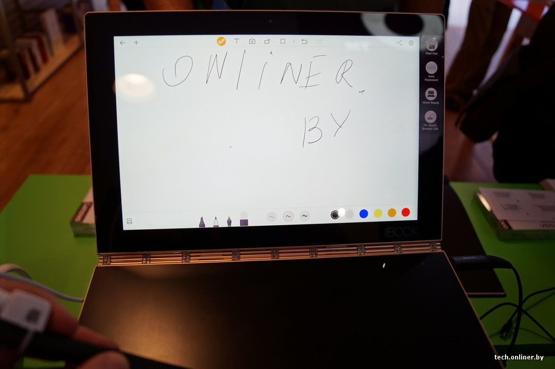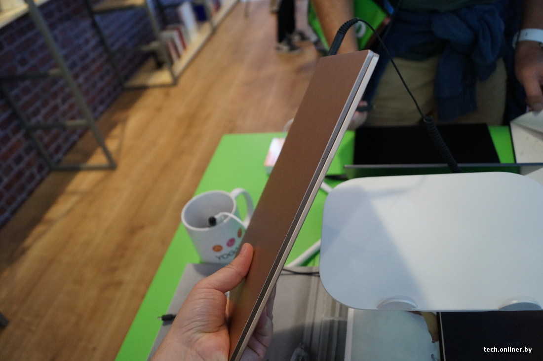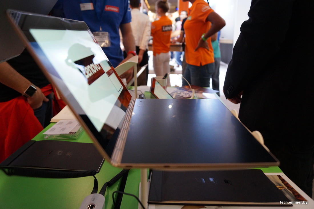 На стенде Lenovo люди толпятся у Yoga Book. Этот то ли планшет, то ли ноутбук и выглядит чуднó, и функционалом может похвастаться необычным. Нижняя часть лэптопа (для удобство назовем устройство так) представляет собой сплошную сенсорную панель от Wacom. Она же выступает в роли клавиатуры. Кроме того, вы можете положить на поверхность площадки лист бумаги и нарисовать на нем что-нибудь ручкой. Одновременно изображение скопируется на устройство. Одно плохо — рисовать надо медленно, распознавание текста и перенос его на дисплей пока работает так себе.