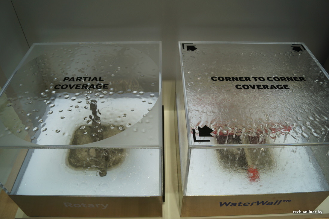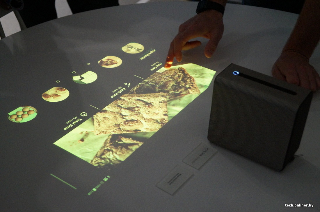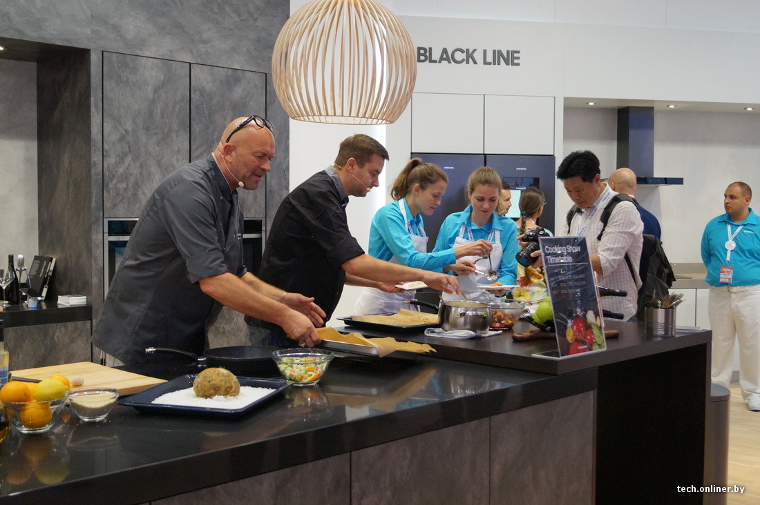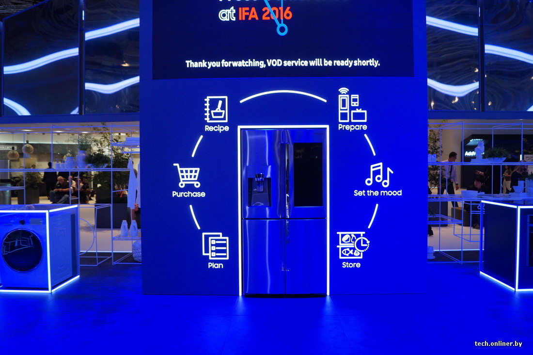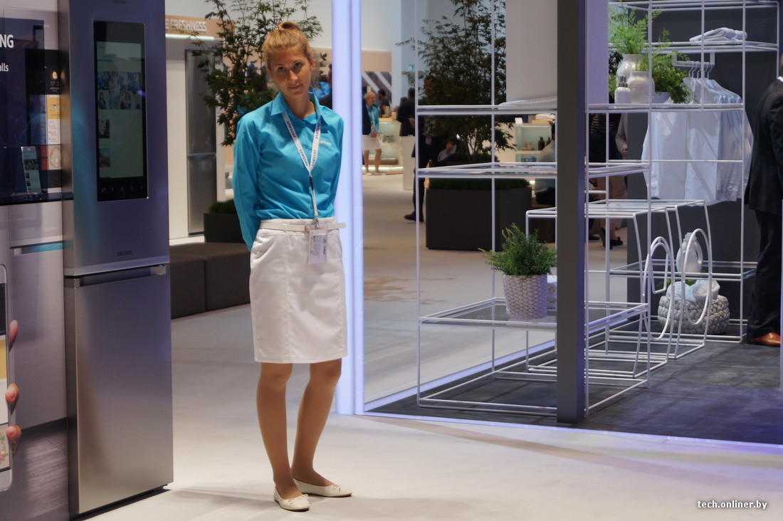 Особенно в Samsung гордятся новым холодильником со встроенным дисплеем. Управлять агрегатом можно через интернет. Кроме того, на экран можно вывести изображение с телевизора. Нас заверили, что девайс самостоятельно следит за свежестью продуктов, правда, если вы переставите какой-нибудь из них, придется вручную делать корректировку. В целом же сложилось впечатление, что обычный холодильник уж очень усложняют — с трудом можно представить, что кто-то действительно будет постоянно тратить свое время на ковыряние в меню новинки.