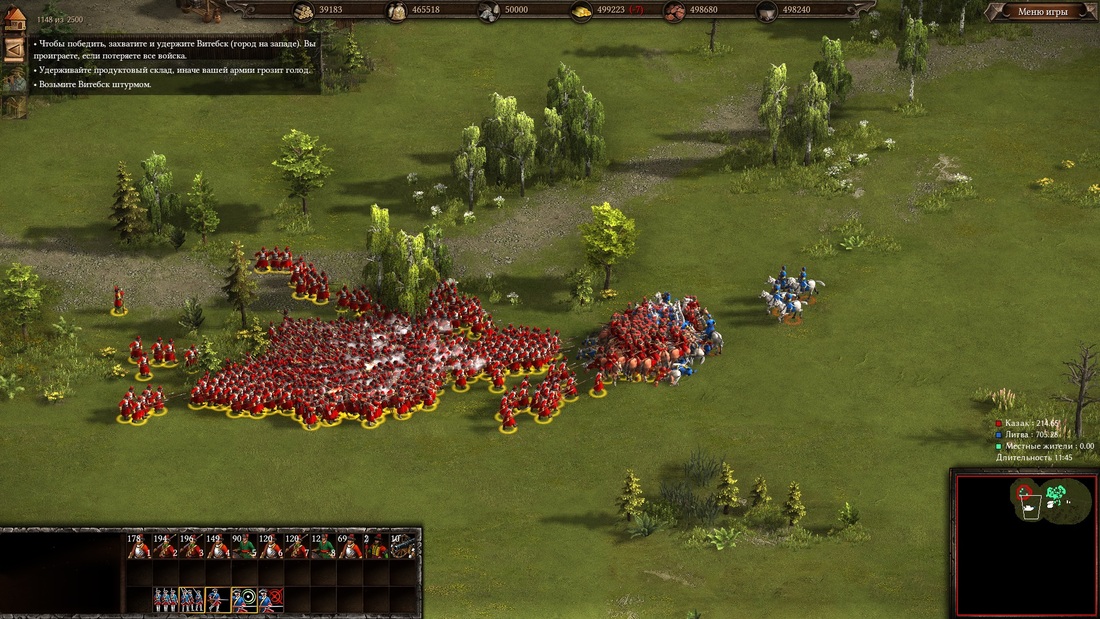 Одна миссия легко займет больше часа. И то под конец сражения будете думать, что поторопились с наступлением, лучше бы еще несколько полков добавили к основным войскам. Битвы выигрываются настоящими армиями — количество бойцов измеряется сотнями, и даже такой оравы не всегда хватает. Иногда удается отправить диверсионный отряд, чтобы тот исподтишка атаковал врага или незаметно пробрался мимо основных сил неприятеля, но весомого преимущества это не даст. Как правило, цель миссии — разбить противника, поэтому массовых боев не избежать.