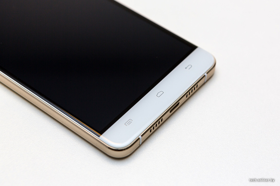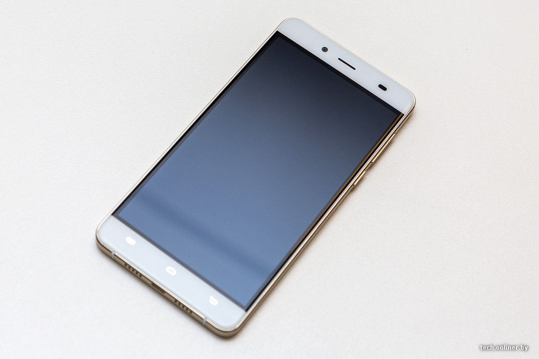 Лицевая панель представляет собой обыкновенный прямоугольник без изысков, новых дизайнерских решений и тому подобного. Ну право, это же не флагман Vertu. Вверху — полоска динамика, по бокам от него — фронтальная камера и набор датчиков, LED-индикатор отсутствует. Под экраном — сенсорные Android-кнопки без подсветки. Все очень бюджетно.