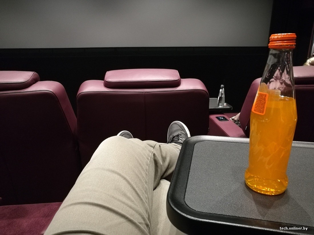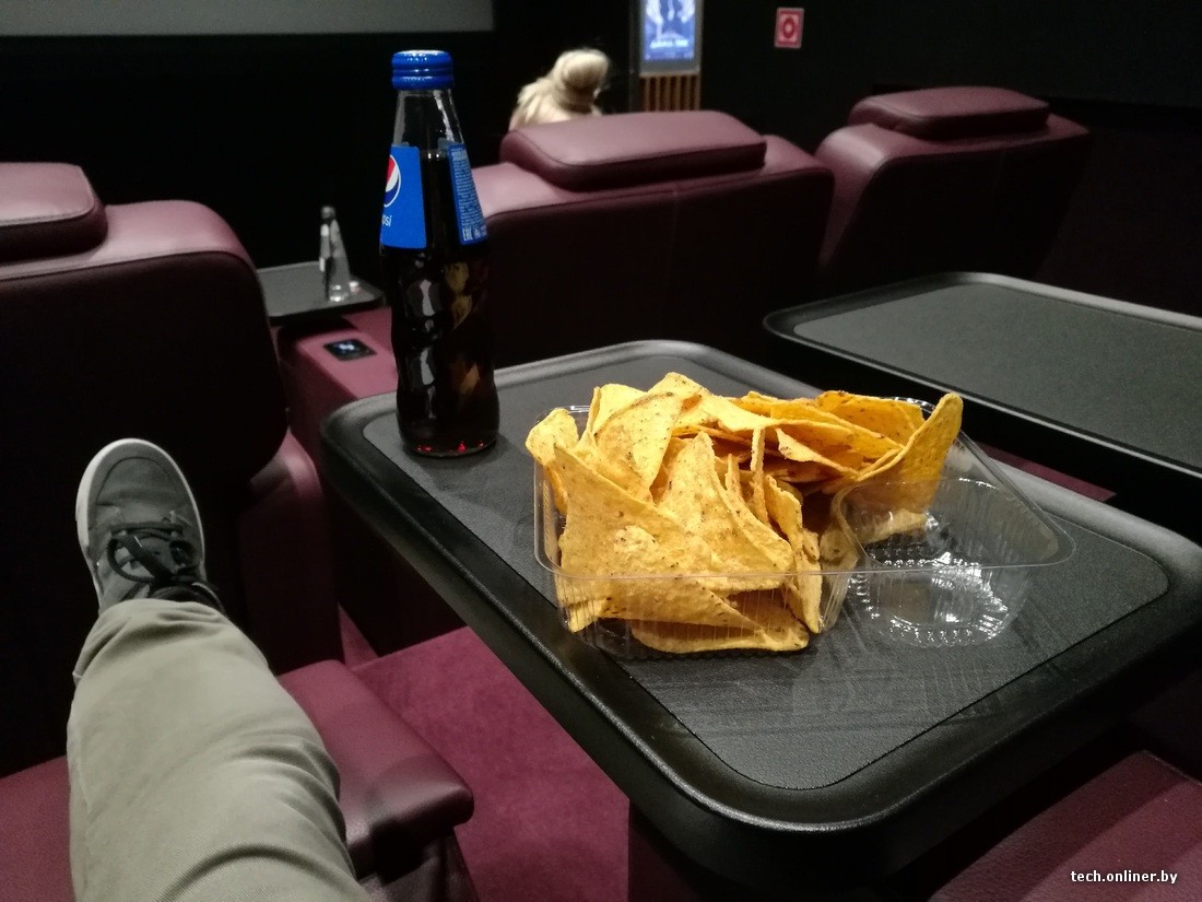 Билеты я взял в маленький зал, где разместилось всего девять сдвоенных диванчиков-реклайнеров. С помощью встроенного блока управления можно отрегулировать уровень наклона спинки и подушки под ногами. Хоть кровать себе устройте — все равно никому не помешаете и фильм сможете смотреть без проблем. Безусловный комфорт.