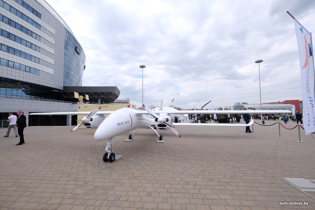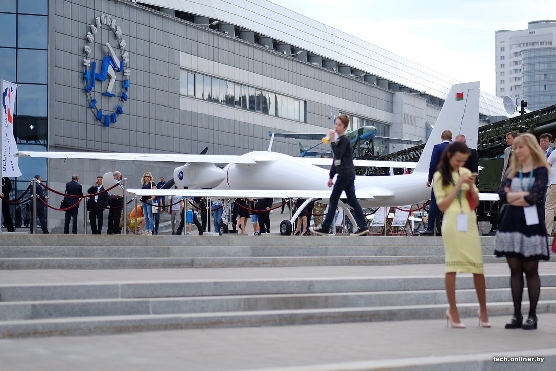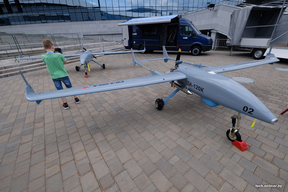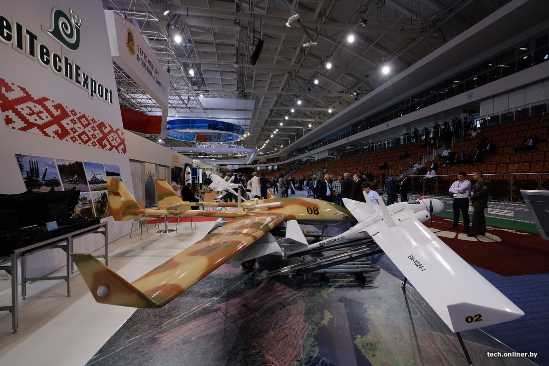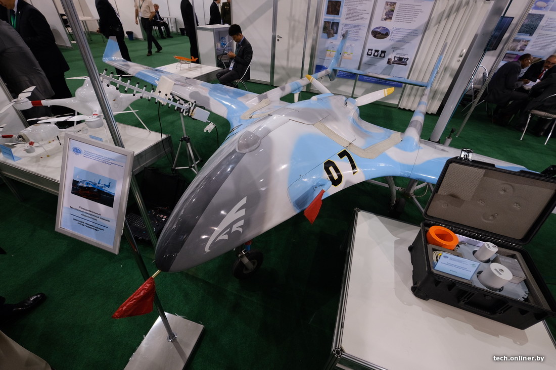 Стоит отметить, что под крышей комплекса очевидно превалировали дроны разных габаритов: от небольших (например, беспилотный авиационный комплекс «Шершень» от белорусской компании «Аэросистема»), которые поместятся в рюкзак, до огромных с размахом крыльев в пару метров. Например, «Бусел М50» не слишком крупный летательный аппарат, однако радиус его действия достигает 50 км, при этом в воздухе он может находиться до 2,5 часов (в зависимости от погодных условий). Здесь также присутствовал ударный беспилотник «Буревестник МБ», способный разгоняться до 200 км/ч и улетать на 300 км.