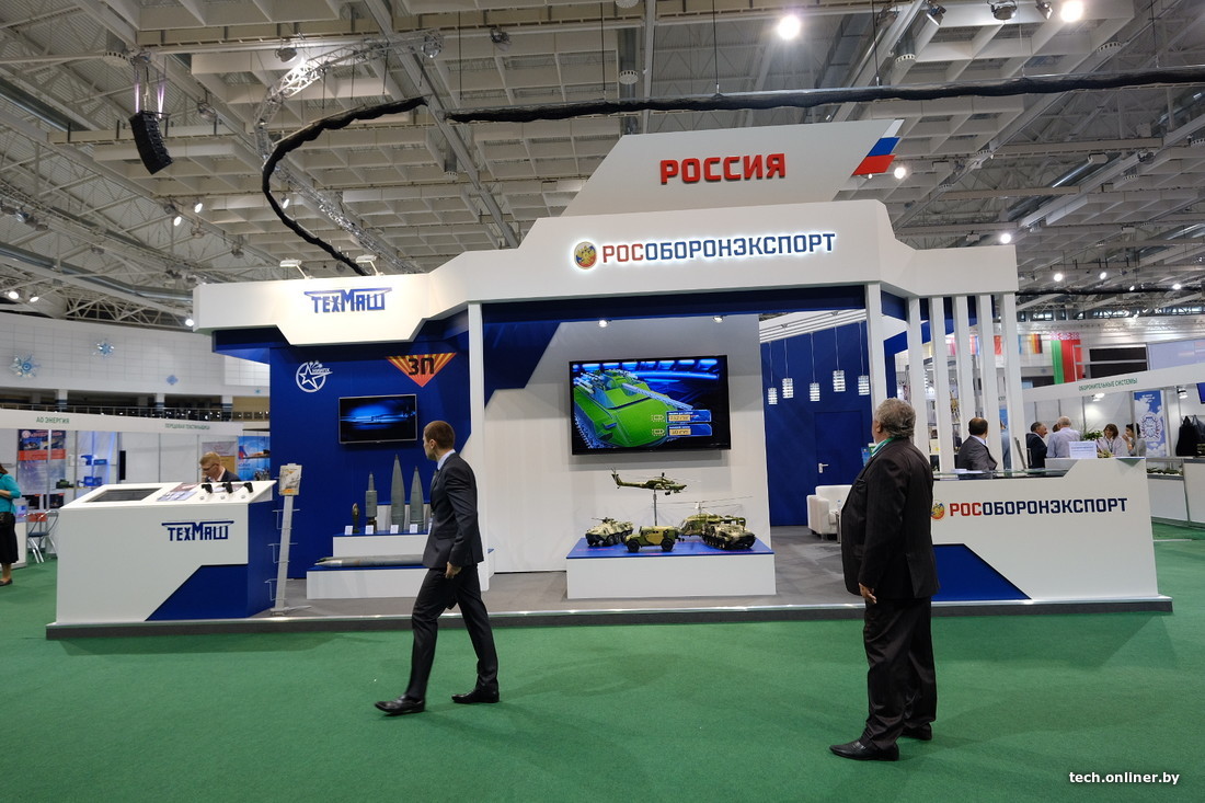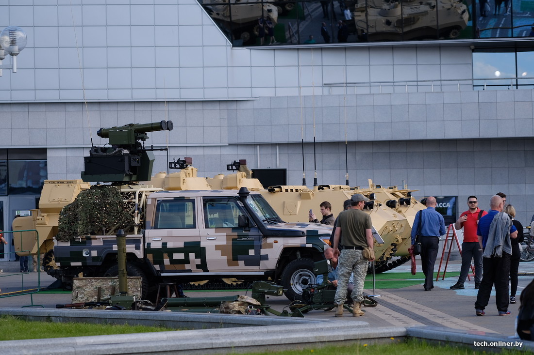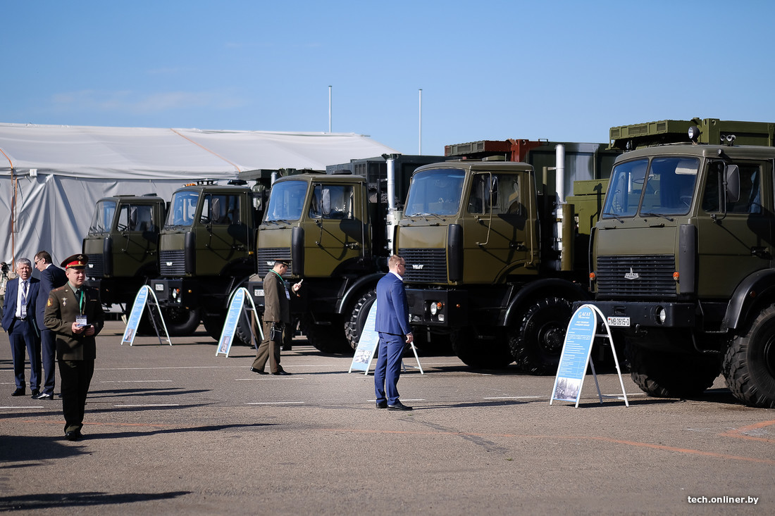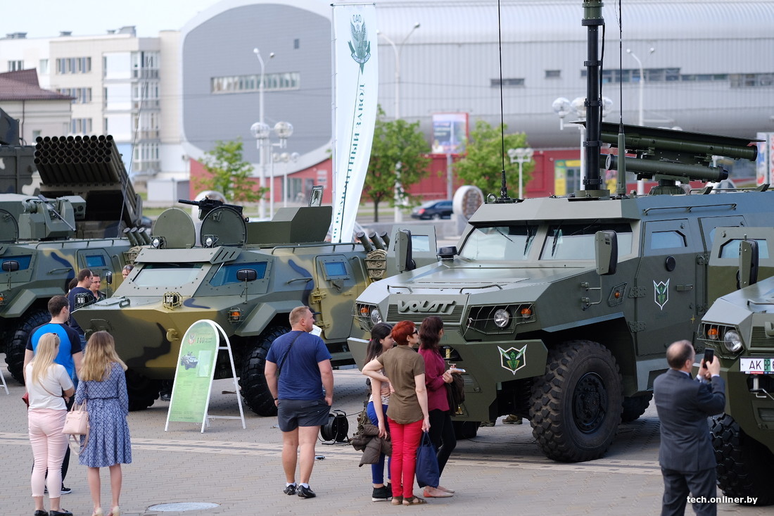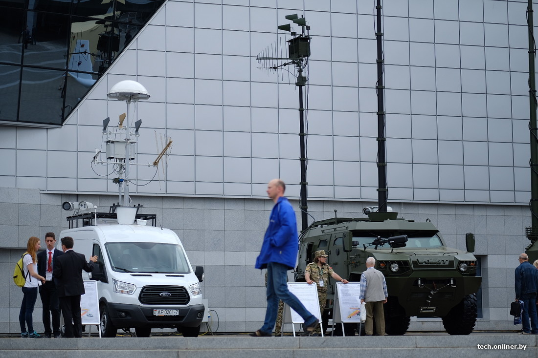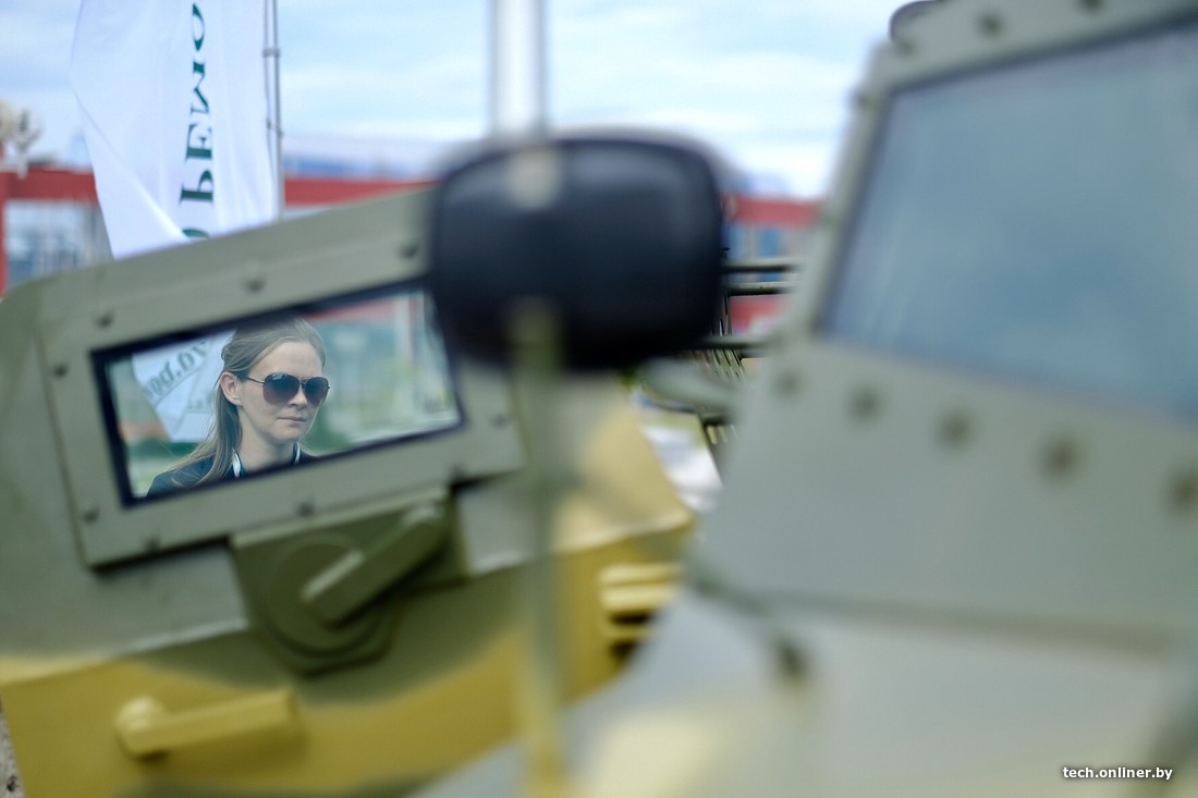 Зона в аэропорту Минск-1 разделена на несколько сегментов, и одну из выгодных позиций занял белорусский производитель «Амкодор». Рядом с танками и огромными автомобилями связи со стремящимися в небо антеннами погрузчики и электрокары выглядели достаточно забавно. Всего же на относительно небольшом пространстве уместилось чуть менее сотни образцов техники.
