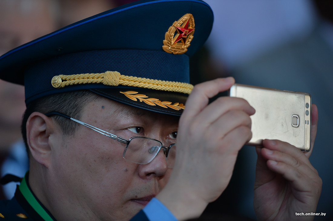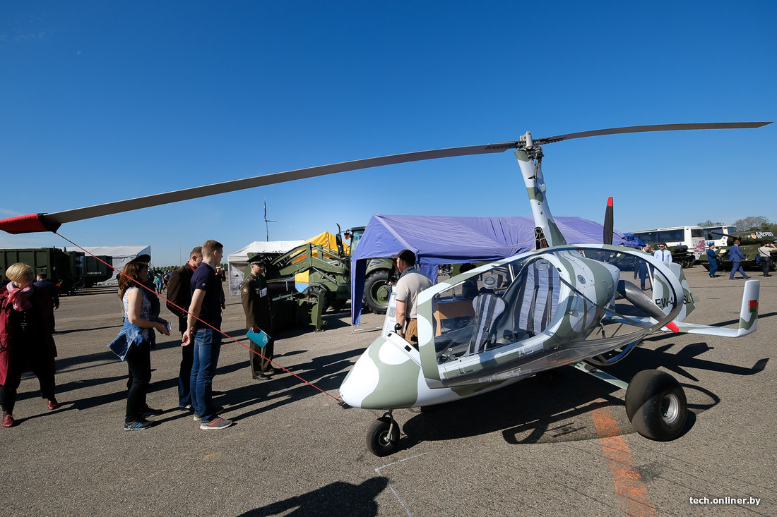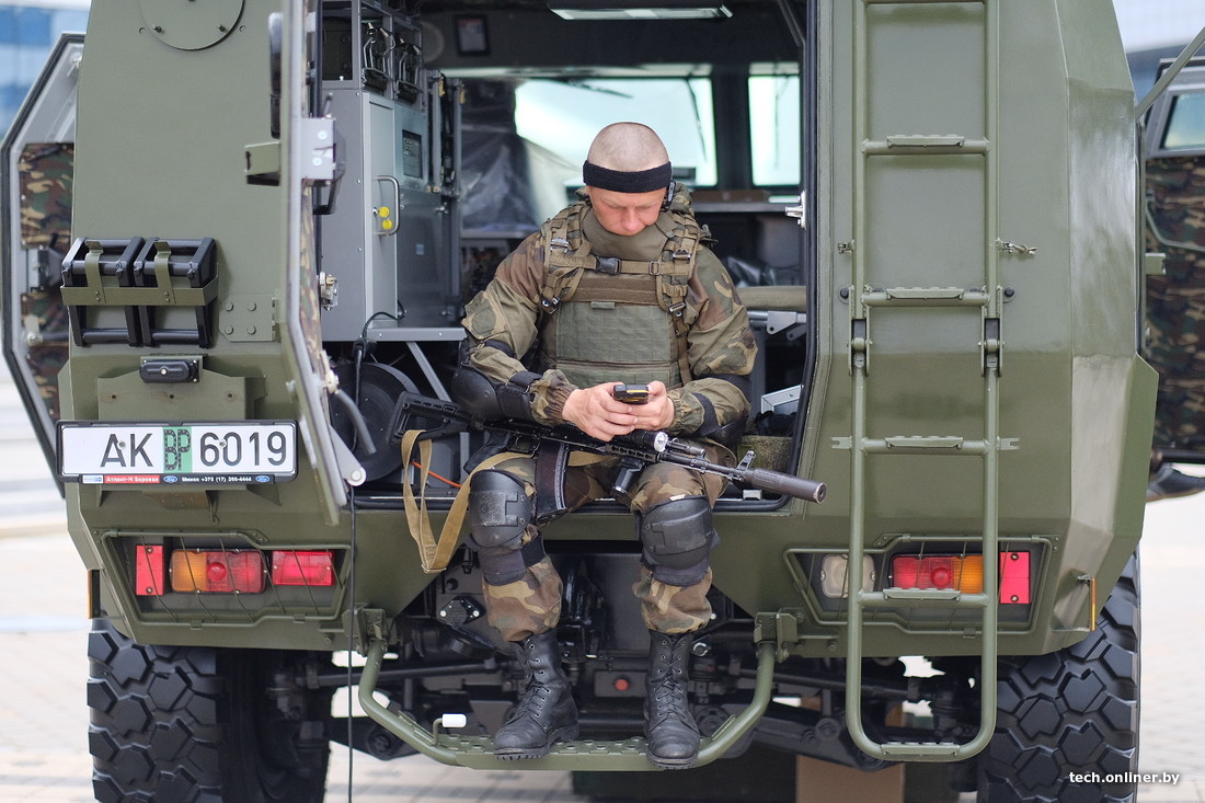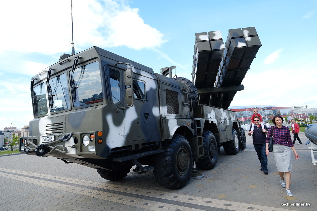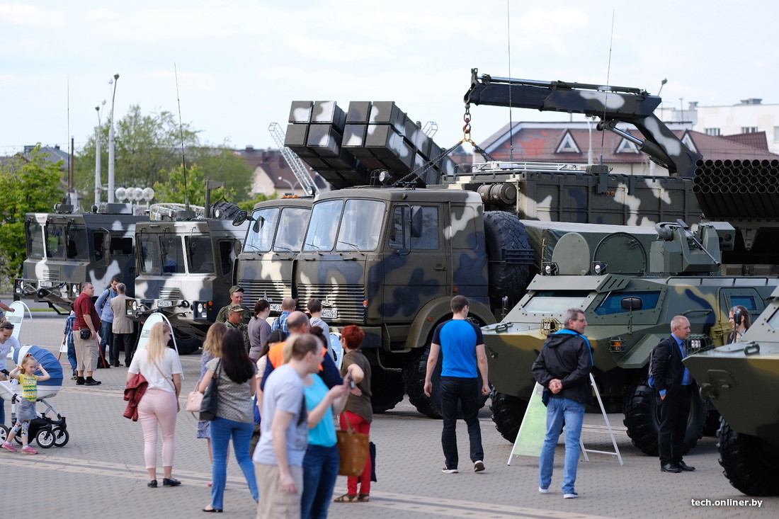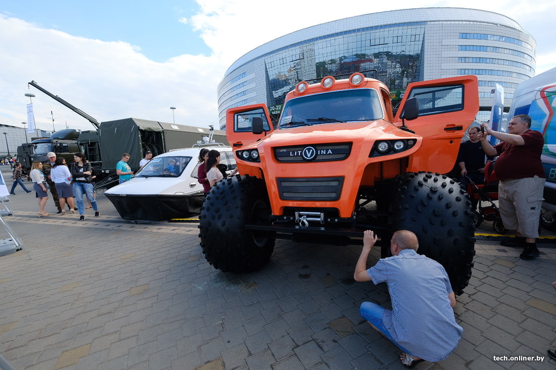 Зона в аэропорту Минск-1 разделена на несколько сегментов, и одну из выгодных позиций занял белорусский производитель «Амкодор». Рядом с танками и огромными автомобилями связи со стремящимися в небо антеннами погрузчики и электрокары выглядели достаточно забавно. Всего же на относительно небольшом пространстве уместилось чуть менее сотни образцов техники.