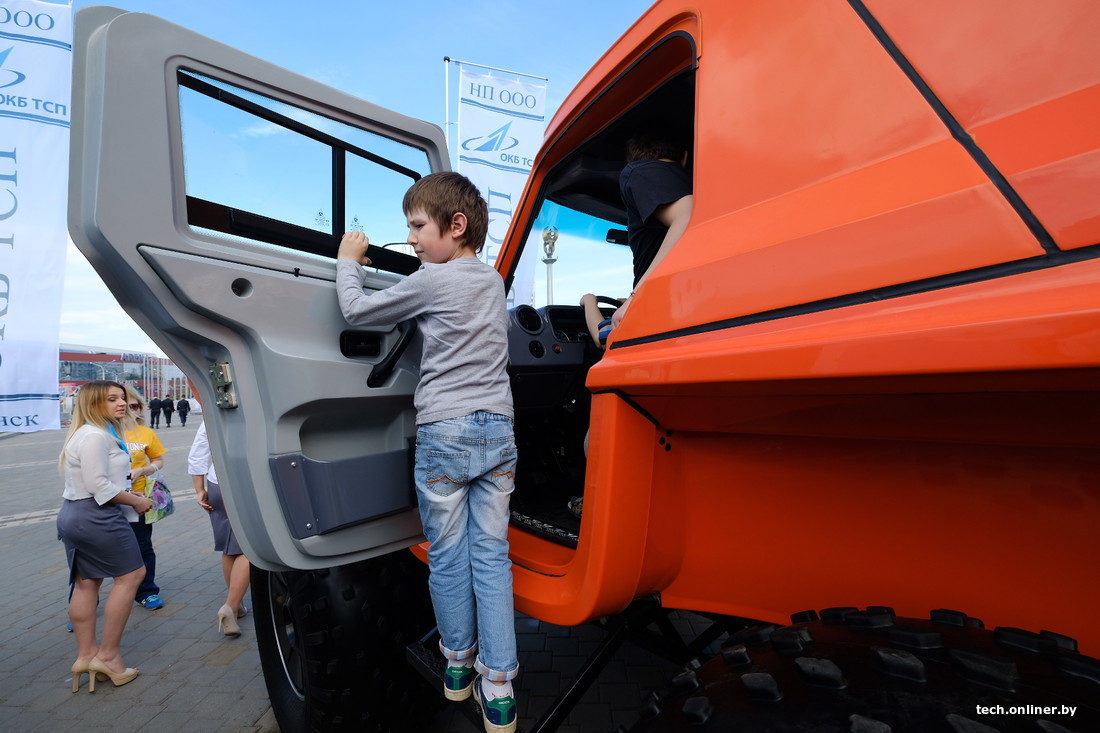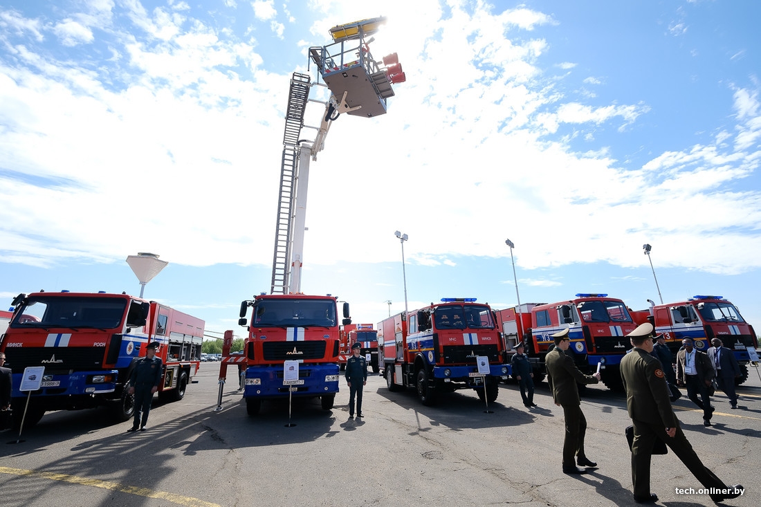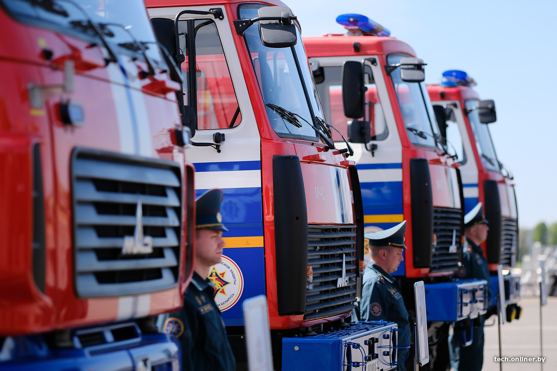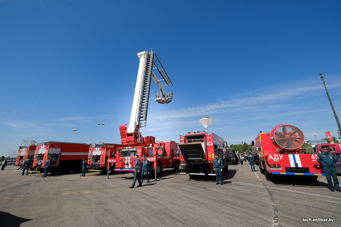 Свою технику продемонстрировало белорусское МЧС, рядом расположился гоночный МАЗ.