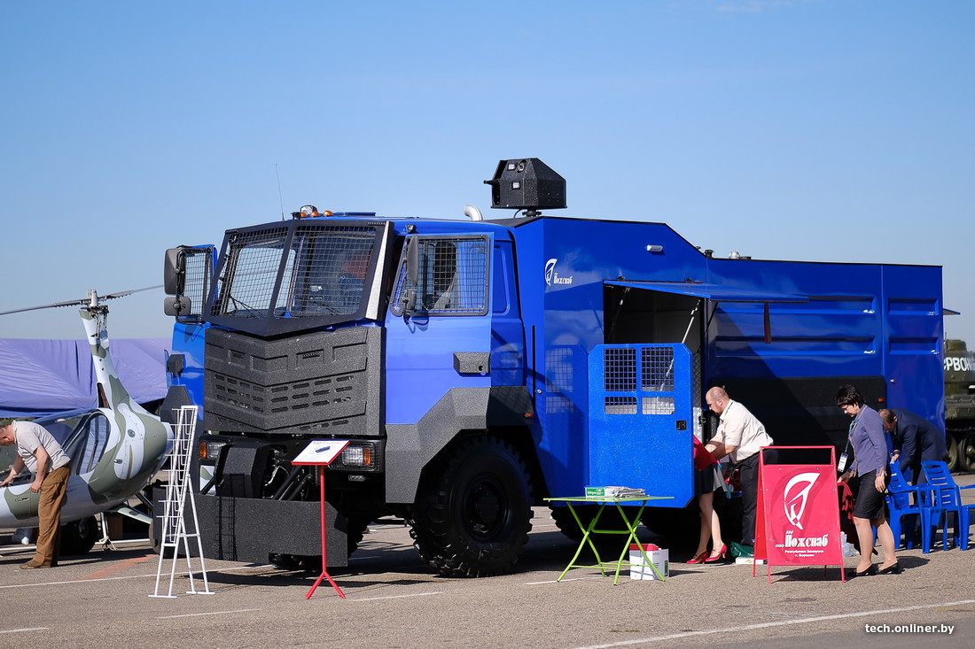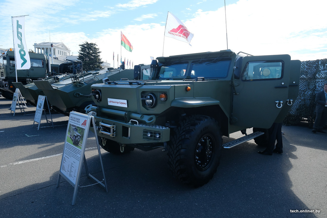 По соседству — шеренга «Волатов». МЗКТ привез на MILEX-2017 легкобронированный автомобиль МЗКТ-490100-010, способный перевозить до 10 человек. «В базе» он оснащен автоматической коробкой передач, длинноходовой независимой пружинной подвеской, фильтровентиляционной установкой, кондиционером, системой дымоудаления, энергопоглощающими сиденьями десантного отсека и так далее. Разгоняется МЗКТ-490100 до 120 км/ч.
