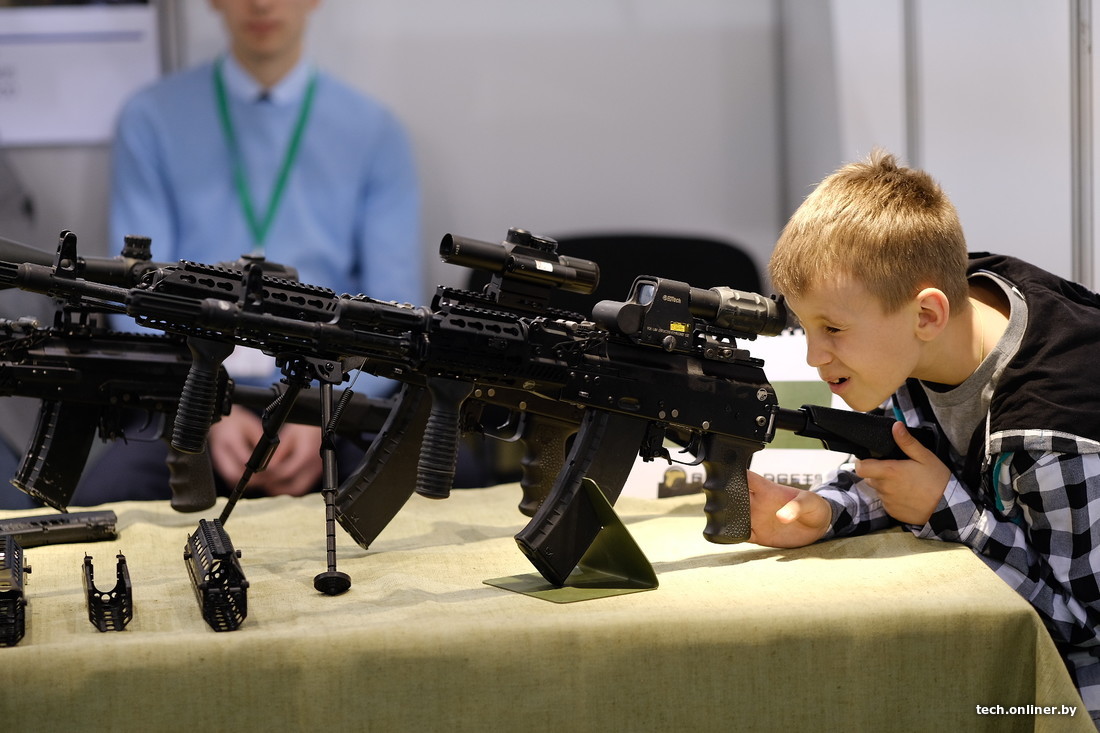Традиционно толпились посетители вокруг стендов с оружием, пусть и охотничьим, а также с холодным — ножами, тесаками и пр. С трудом, но мы все-таки нашли как минимум одного робота на выставке, им оказался противотанковый комплекс «Богомол», управляемый оператором удаленно с расстояния до 300 метров.