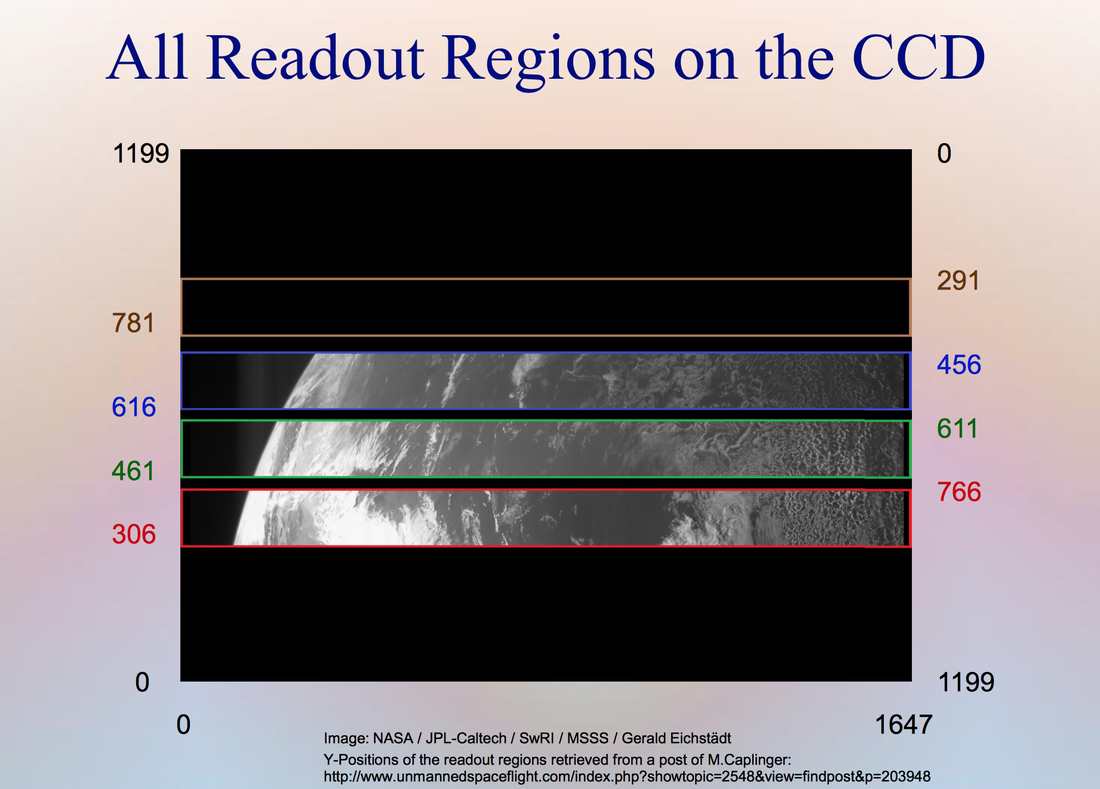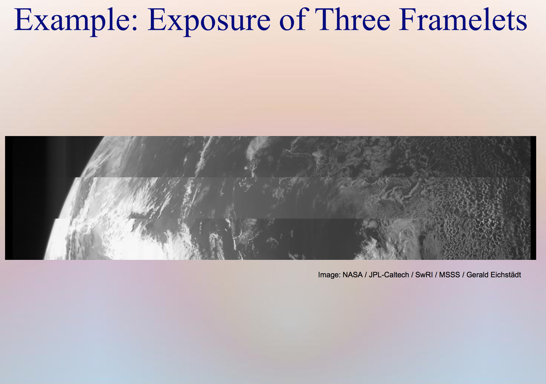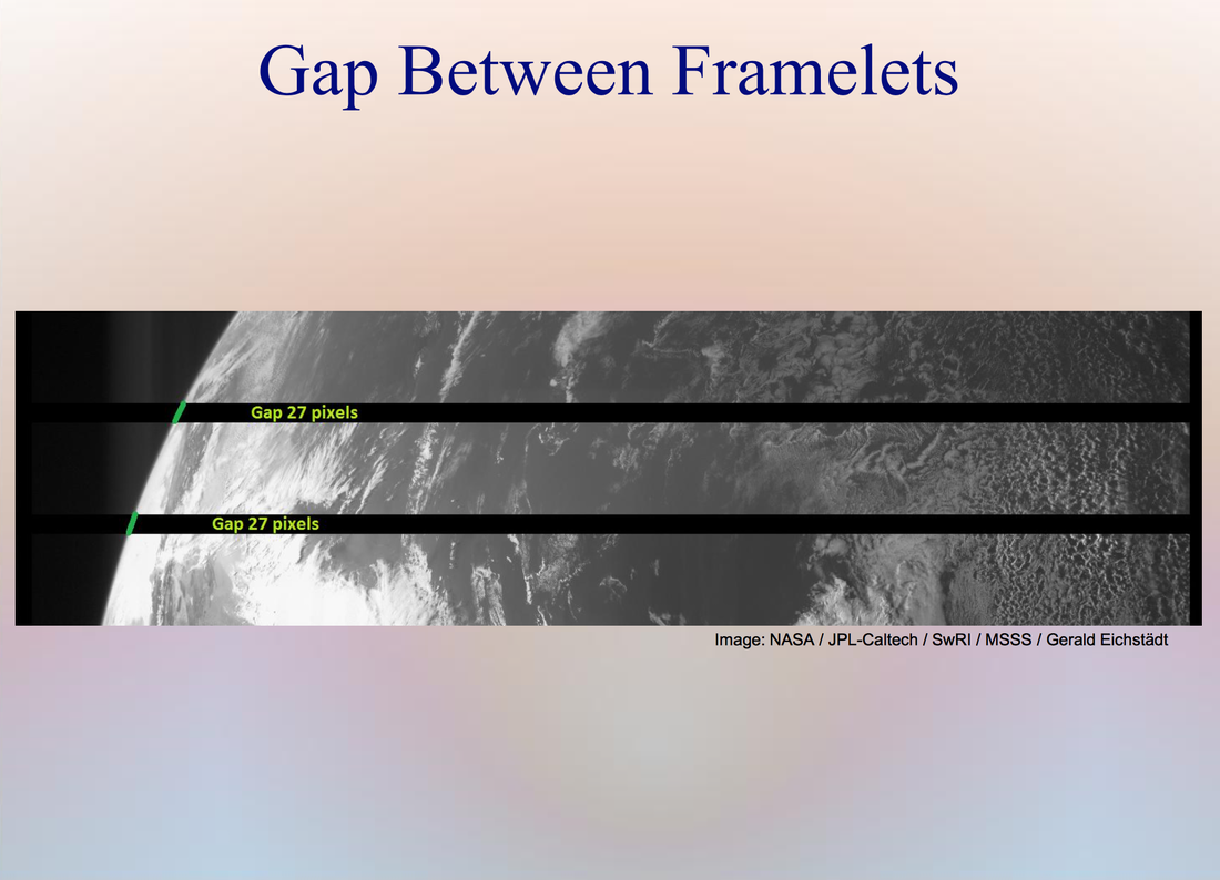 Для стабилизации аппарата в полете и равномерной работы инструментов, закрепленных на гексагональном корпусе, «Юнона» постоянно вращается вокруг одной из своих осей. Поэтому Junocam, намертво зафиксированная в конструкции аппарата, очень зависима от его положения в пространстве. При каждом витке вращения она делает несколько кадров, каждый раз снимая три области объекта сразу через три световых фильтра — красный, синий и зеленый. В следующем кадре область, которую захватывает Junocam, слегка смещается. При последующем обороте Junocam начинает процесс снова, захватывая области, пропущенные в прошлом. Таким образом, через 82 кадра, используя вращение, камера зонда целиком «сканирует» объект, последовательно записывая черно-белыми полосами в один снимок информацию о яркости каждого цвета. Для того чтобы из этого набора черно-белых полос получить цветное изображение, нужно немного поколдовать: