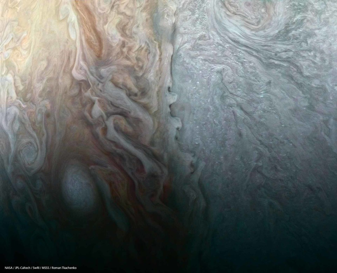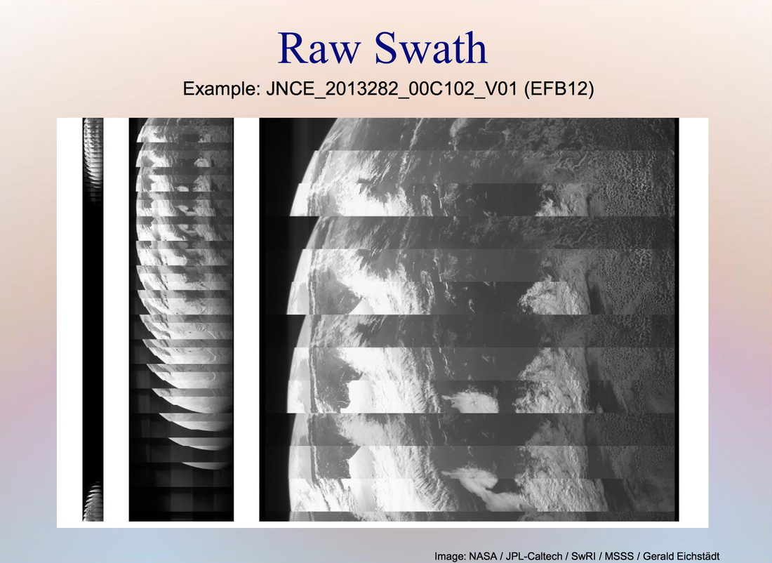 Иногда бывает недостаточно знать, какие преобразования проходит фото по пути к вашим гаджетам и глазам, чтобы понять, как из «сырого» снимка космического аппарата получить что-то более понятное человеческому глазу. Например, как в случае с автоматической межпланетной станцией «Юнона», принцип съемки изображения которой зависит от того, каким образом космический аппарат перемещается в пространстве. «Юнона» была запущена 5 августа 2011 года и сейчас совершает крайне опасные и близкие пролеты у Юпитера, ныряя в его в сверхмощные радиационные пояса. Изначально, учитывая специфику пролетов, NASA вообще не планировало установку визуальных инструментов на эту миссию. Но дух XXI века победил, и теперь у нас есть возможность любоваться завораживающими вихрями штормов Юпитера с рекордно близкого расстояния. Если конечно вы умеете понимать «сырые» фото, которые аппарат передает на Землю. А это та еще задачка.