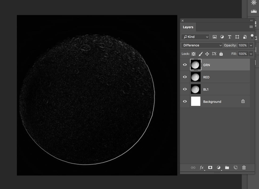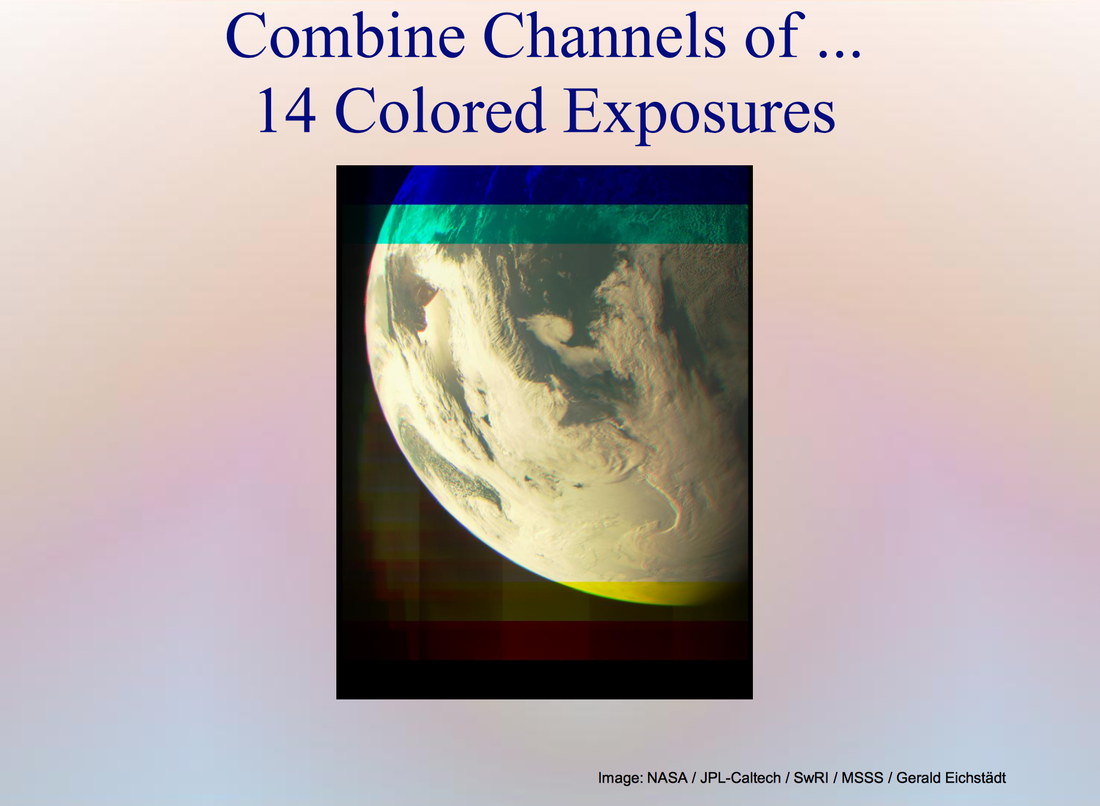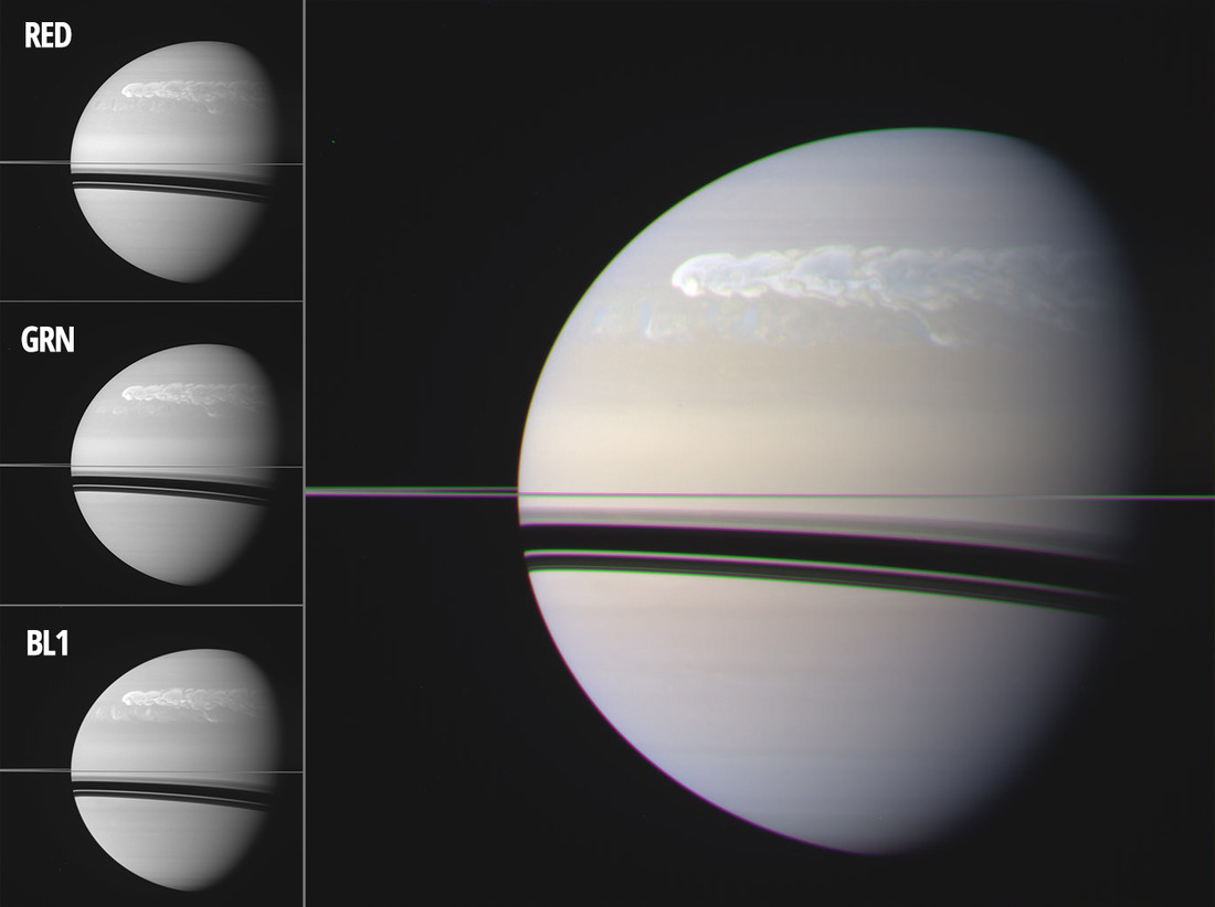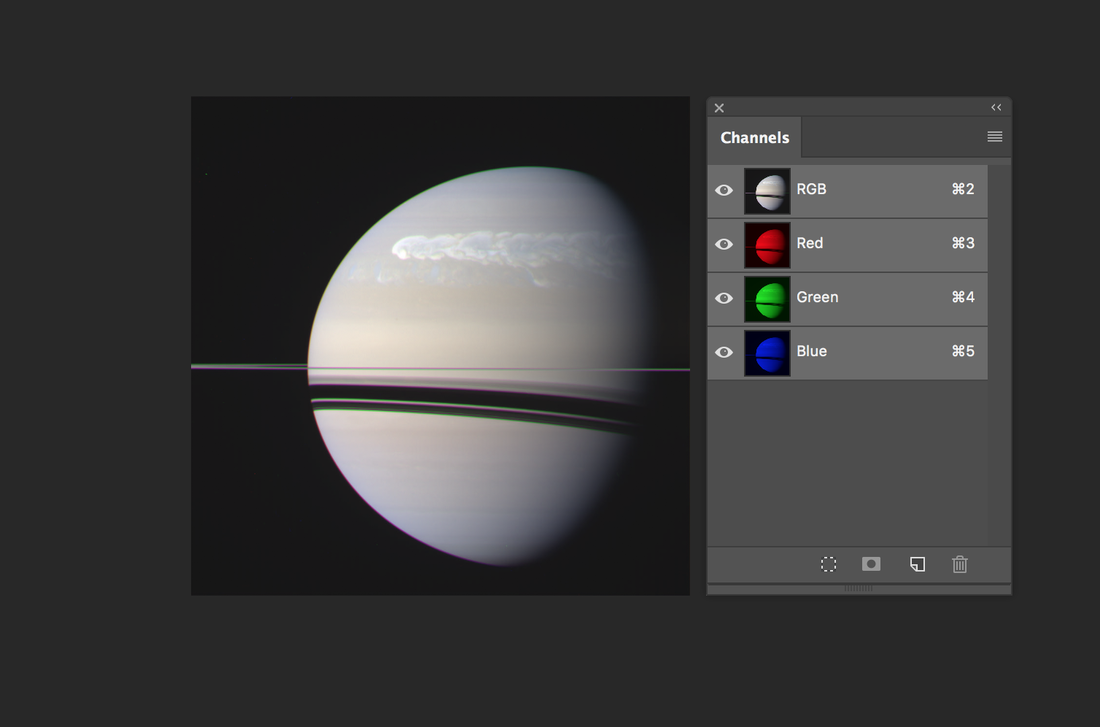Иногда перед склейкой в цвет вам будет необходимо выровнять кадры относительно друг друга. «Кассини» — не зеркальная камера на прочном штативе, а научная платформа, которая перемещается в пространстве со скоростью десятки тысяч км/ч относительно объекта съемки. Так как аппарат постоянно находится в движении, разные цветовые слои, снятые с небольшим интервалом, могут не подходить друг другу при склейке. Исправить это довольно просто, предварительно выровняв кадры относительно друг друга в графическом редакторе.