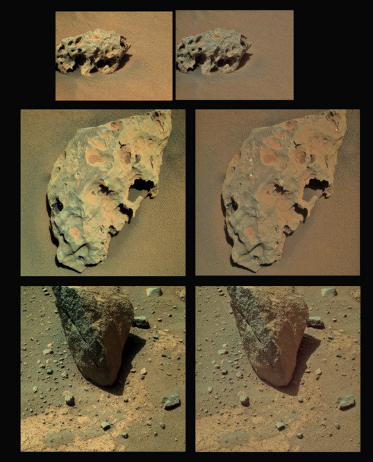 Принцип получения цветного фото из кадров Pancam марсохода такой же, как и из кадров «Кассини»: вам нужно последовательно и через соответствующие каналы наложить друг на друга файлы, в названии которых есть информация о фильтрах, — 2 (красный), 5 (зеленый) и 7 (синий). Но не забывайте, что вы снова используете «сырые» фото, только что полученные из памяти ровера. Они были оперативно сжаты в формат .jpeg с искаженной информацией о цвете. Более того, у Opportunity цветопередача усилена намеренно для лучшего контраста поверхности на снимках. По этой причине цвет неба Марса на многих фотографиях, подготовленных любителями, может быть не красного оттенка, а, например, белого или даже слегка голубого. В свое время непонимание этого породило несколько противоположных конспирологических теорий, среди любителей заговоров. И много свежих шуток о любителях заговоров среди астрономического сообщества. Согласитесь, если бы иллюминаты-заговорщики из NASA хотели от вас что-то скрыть, скорее всего, они бы подготовились получше и складывали в архив миссии кадры, которые уже прошли процесс калибровки. Правильно откалиброванные фото Opprotunity со временем также появляются в Planetary Data System. Но так как сегодня мы говорим не о них, просто помните о нюансах потери информации о цвете после использования файла для публикации в интернете.