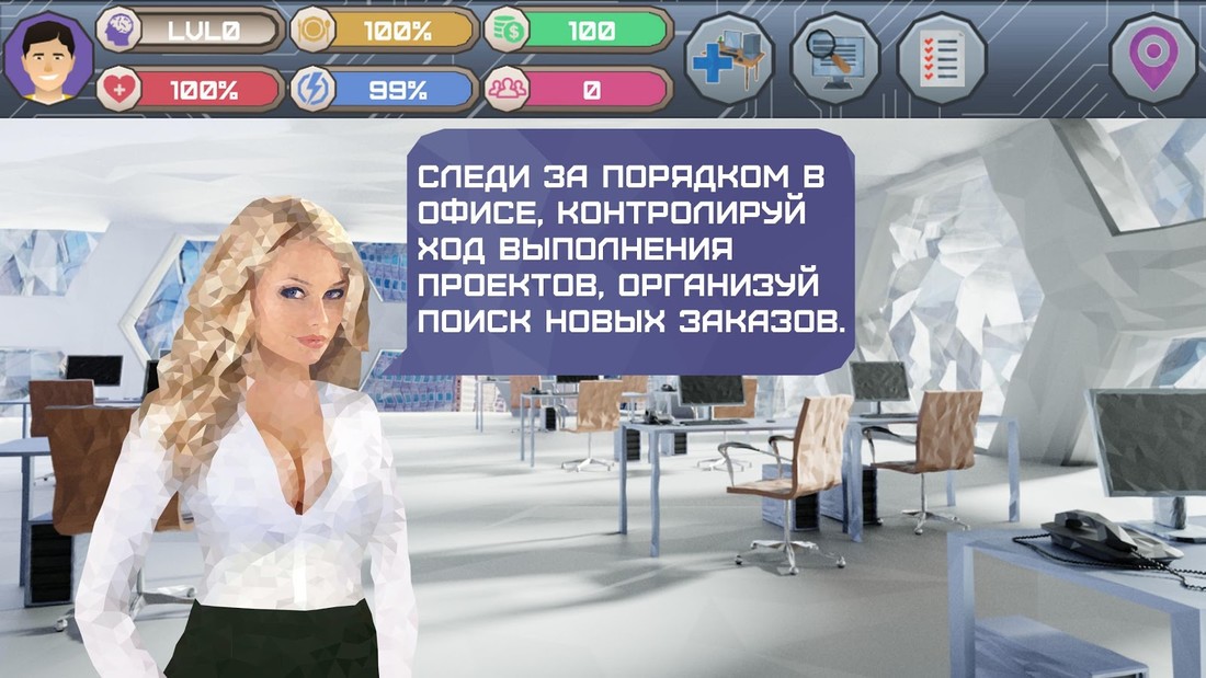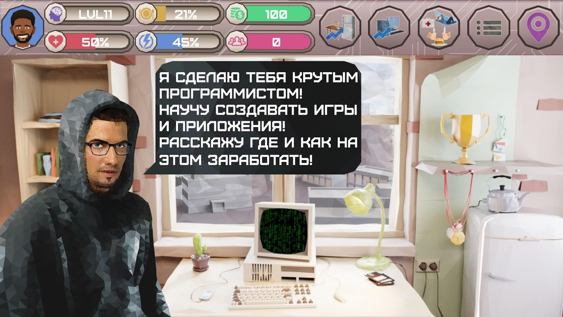 «Тебе предстоит пройти путь от обычного „чайника“ до богатейшего компьютерщика планеты. На этом пути у тебя будет много приключений: ты будешь жить в самых дорогих домах, откроешь собственный офис, примешь участие в большом количестве соревнований и конференций, наберешь миллионы подписчиков в социальных сетях», — обещает создатель игры.