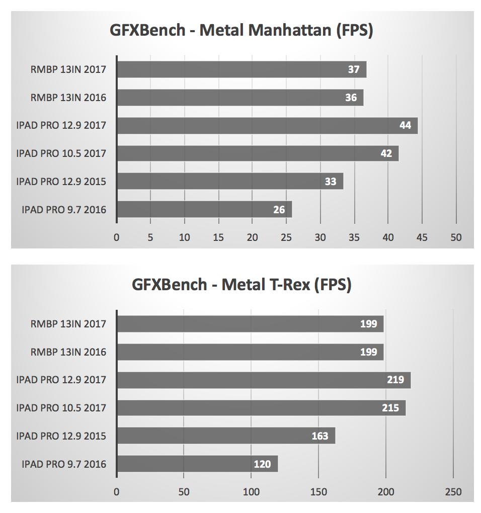 Тесты проводились в бенчмарках GeekBench и GFXBench. В испытаниях, рассчитанных на проверку вычислительных возможностей процессора, победу одержал новый MacBook Pro. Зато планшеты смогли опередить ноутбук прошлого модельного года.
