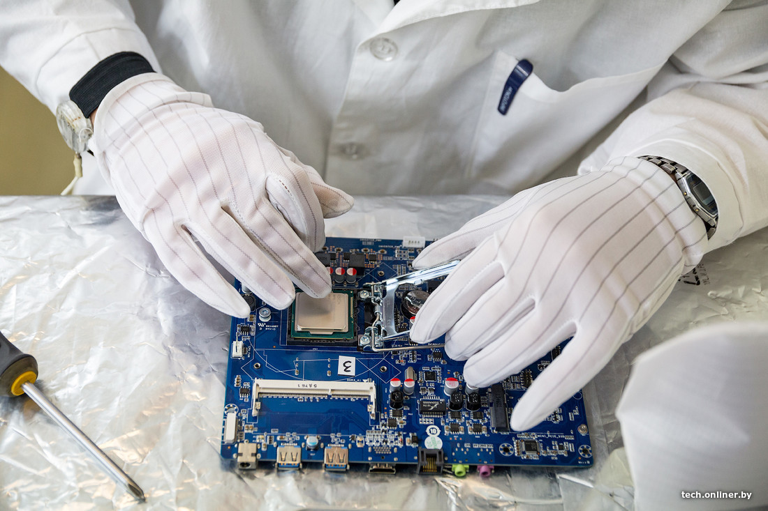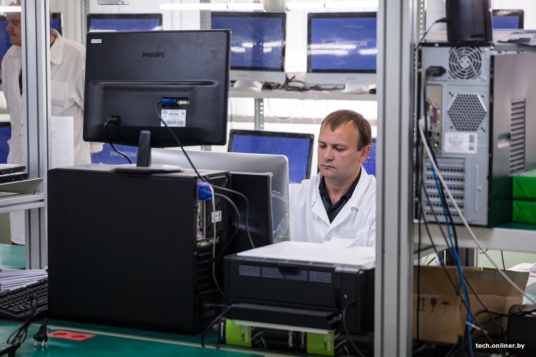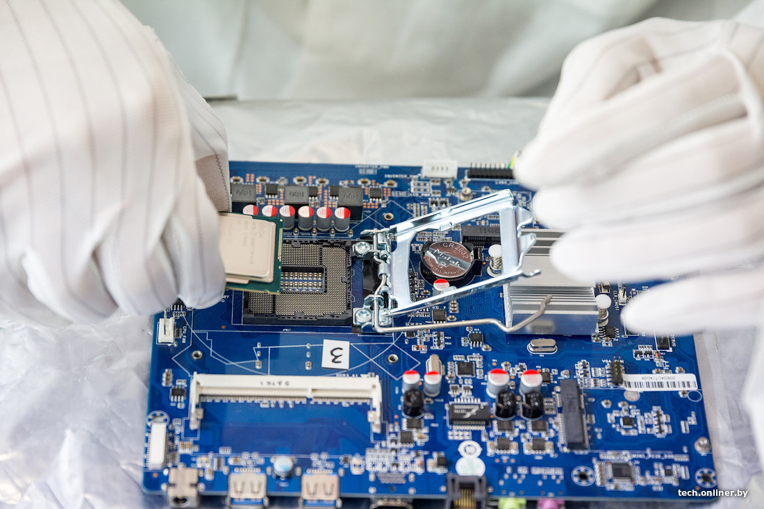 Производство все там же — проезжаем ЦУМ и через проходную с охраной (все серьезно!) оказываемся на территории предприятия «Амкодор-Белвар». В цеху нас встречает старый знакомый. Это Виктор Иванович — ведущий инженер, который досконально знает обо всех нюансах запуска производства компьютеров.