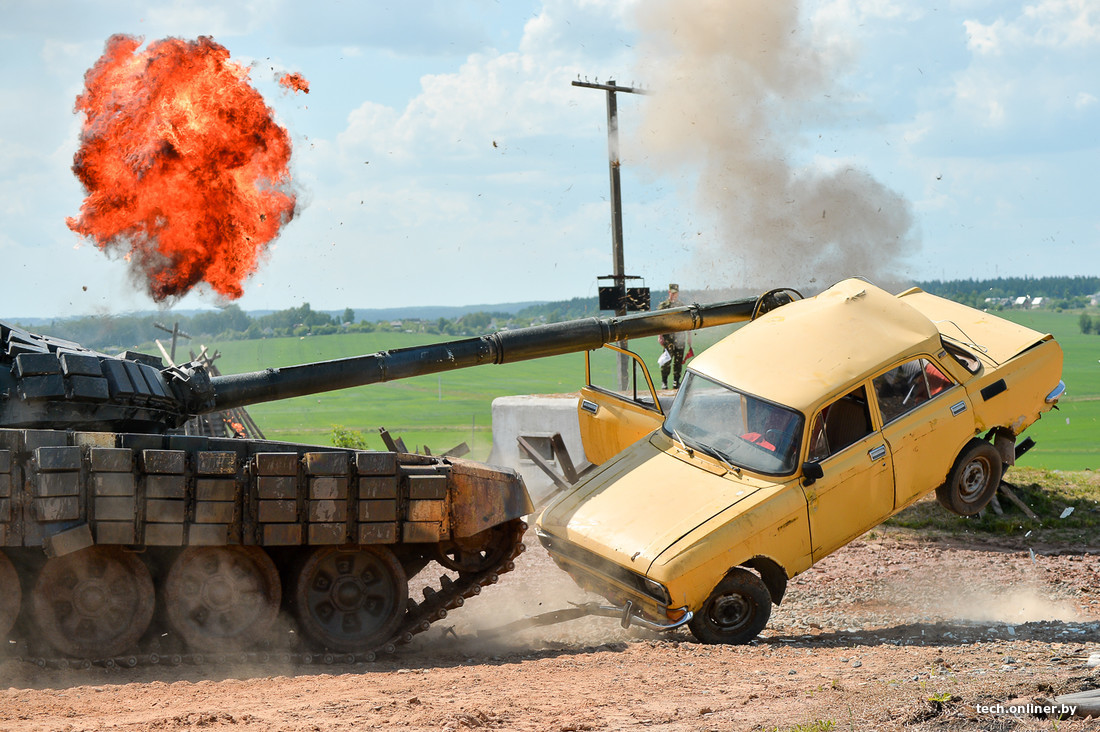 Главная задача, которая стояла перед экипажами боевых машин, — поразить мишени, преодолев двухкилометровую дистанцию с препятствиями в виде водяных рвов, горок и… легковых автомобилей. Некоторые «Москвичи» и «Жигули» даже прокатили на стволе танка. Естественно, после такого наезда дальнейшая эксплуатация машин представляется маловероятной.