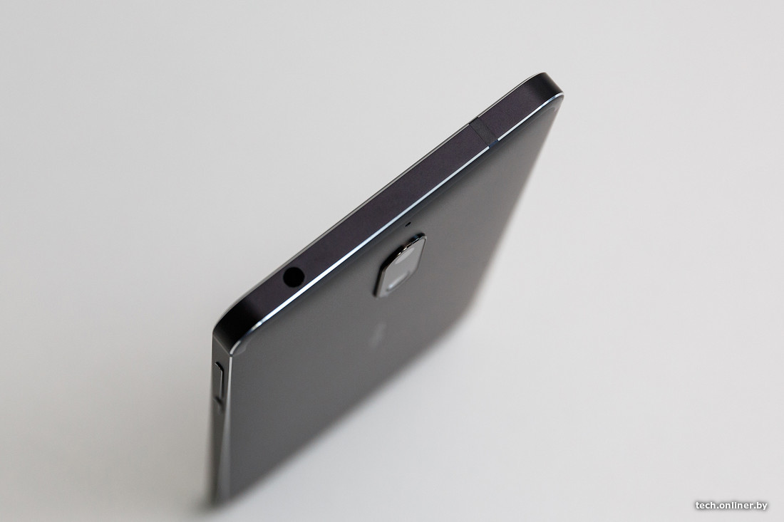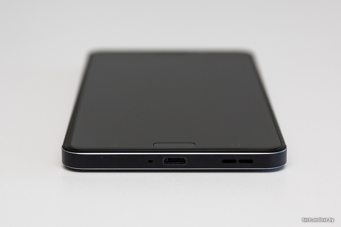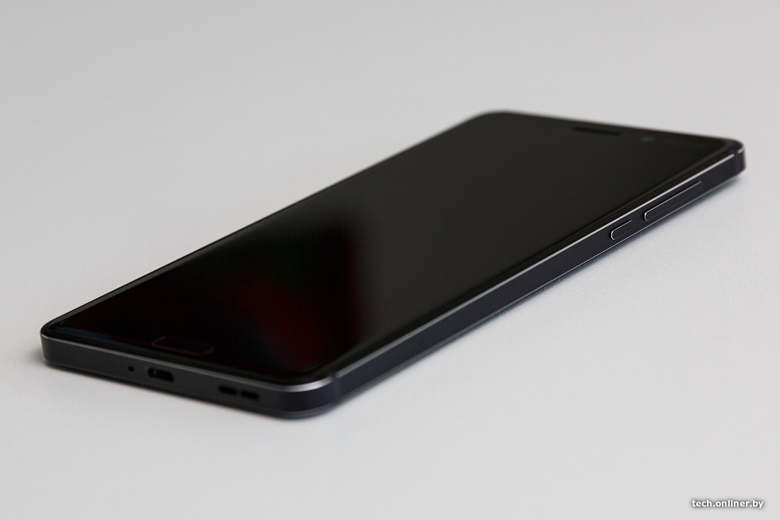 Под дисплеем три виртуальные кнопки. Две подсвечиваются и отвечают за запуск списка последних запущенных приложений и возвращение на шаг назад. Третья продолговатая и чуть утоплена в корпус — сюда встроен дактилоскопический датчик.