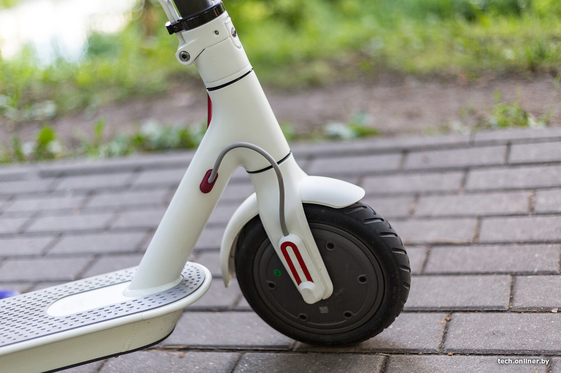 Электросамокат Xiaomi больше своих «обыкновенных» собратьев и тяжелее. Преодолевать заниженные почти в ноль бордюры на нем можно, но не слишком удобно — маленькие камерные колеса не позволяют сделать этого, а запрыгнуть не выйдет из-за веса. Поэтому приходится спешиваться и приподнимать самокат над землей. Небольшой радиус колес представляет неудобства при передвижении по плохо уложенной плитке, особенно если нарушена ее целостность. По асфальту же — никаких проблем. Еще один нюанс — малый угол поворота руля. При передвижении по городу на это не обращаешь внимания, а вот для разворота необходимо место, много места.