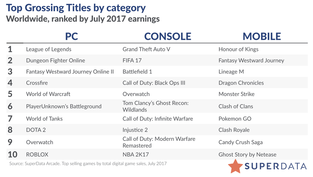 Первую строчку занимает самая популярная MOBA-игра планеты League of Legends, мало популярная на пространстве бывшего СССР. Следом идут корейская 2D-гриндилка Dungeon Fighter Online и пользующаяся бешеной популярностью в Китае MMORPG Westward Journey Online II. Выстрелившая весной PlayerUnknown’s Battlegrounds только за июль разошлась тиражом в 6 млн копий.