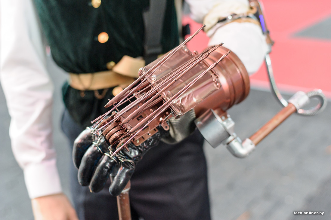 «Я полностью его придумал и изготовил сам. На этот костюм, если честно, я потратил четыре дня. В нем есть металлические и пластиковые элементы, ткань, стекло. Рука работает на тросах, она полностью раскрывается. Но делал в спешке, поэтому тросы иногда рвутся (смеется. — Примечание Onliner.by)», — рассказал он. Если вы обратили внимание, для создания костюма пригодились некоторые части от зонта да детский железный конструктор.