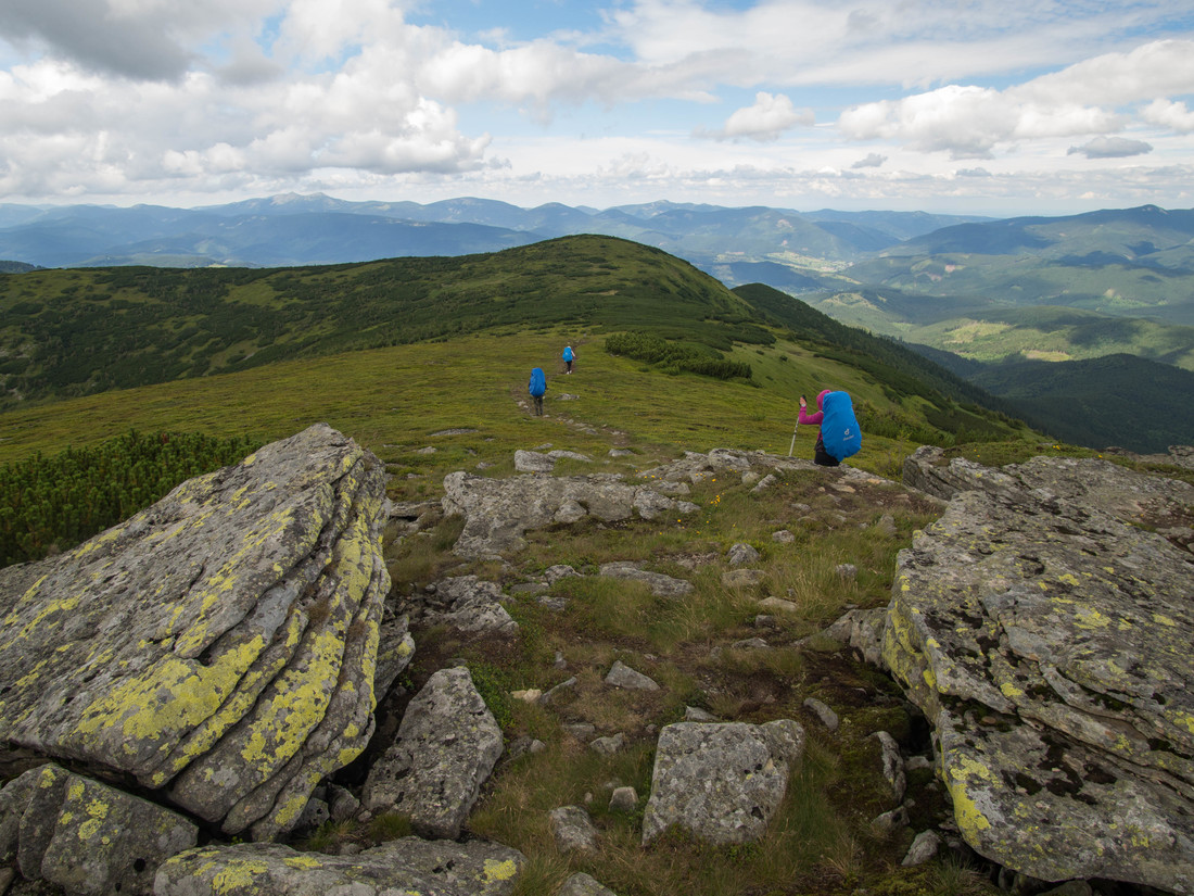 На следующий день, проснувшись рано утром в надежде поснимать горы на рассвете, мы обнаружили, что находимся в настоящем облаке! Пока мы собирали палатки и завтракали, небо прояснилась, и под знойным украинским солнцем наша экспедиция тронулась дальше.