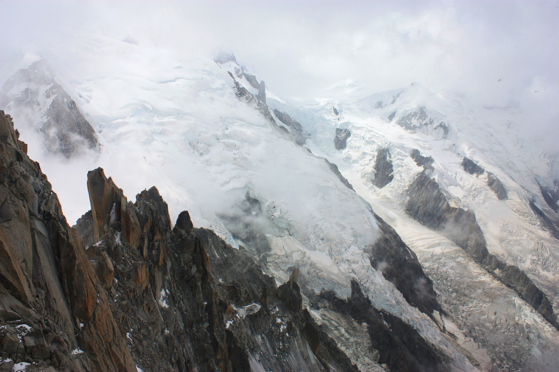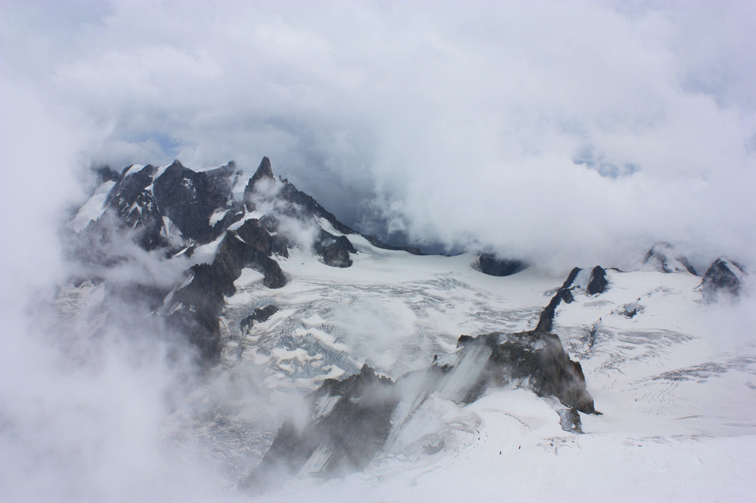 Сравнительно быстро и комфортно оказываешься на самом пике Эгюий-дю-Миди. Внизу, в Шамони, сыплет угрюмый дождь, но на высоте более 3800м, над облаками – только резкие, пронзительные порывы ветра и звенящая тишина.