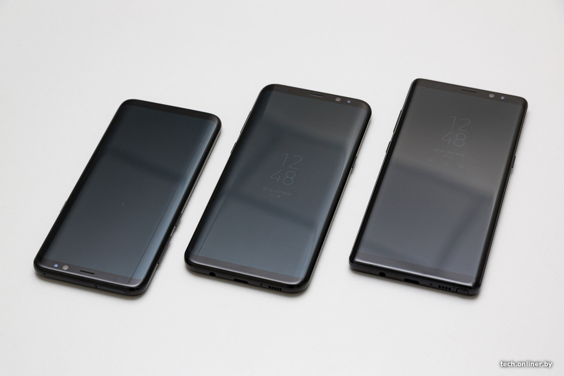 По размерам Note 8 близок к Galaxy S8+. Первый имеет габариты 162,5 × 74,8 × 8,6 мм и вес 195 г, второй — 159,5 × 73,4 × 8,1 мм и вес 173 г. Разница заметна лишь при непосредственном сравнении. У новинки привычная для флагманских устройств Samsung форма: плавные изгибы, закругленные углы, загнутый по краям «бесконечный» дисплей.