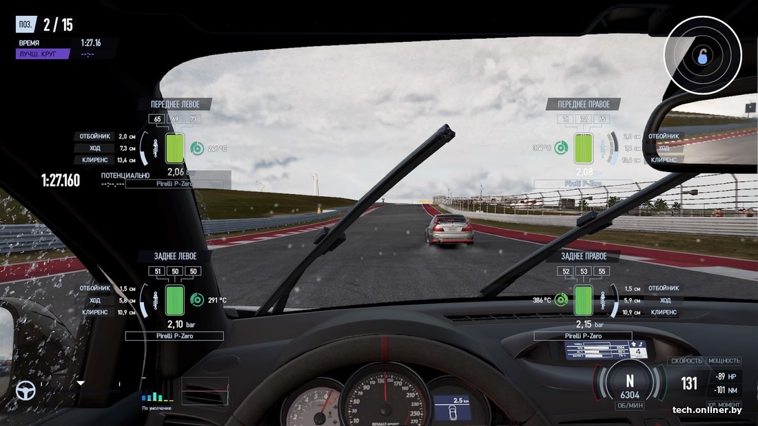 Хотя более правильно будет влезть в самые дебри настроек и деловито надвигать там ползунков. Игра позволяет творить с машиной что угодно — хоть каждое колесо «обуть» в разный тип шин. Зачем это надо, дело десятое — в симуляторах важно обилие возможностей, а не то, будете ли вы их использовать. Project CARS 2 обрабатывает огромное количество параметров, причем они не где-то там в недрах игры, а прямо на виду. Позволяется вывести подробную информацию во время гонки: считывать ее совершенно некогда, но при необходимости можете узнать температуру каждой шины и другие особенности.