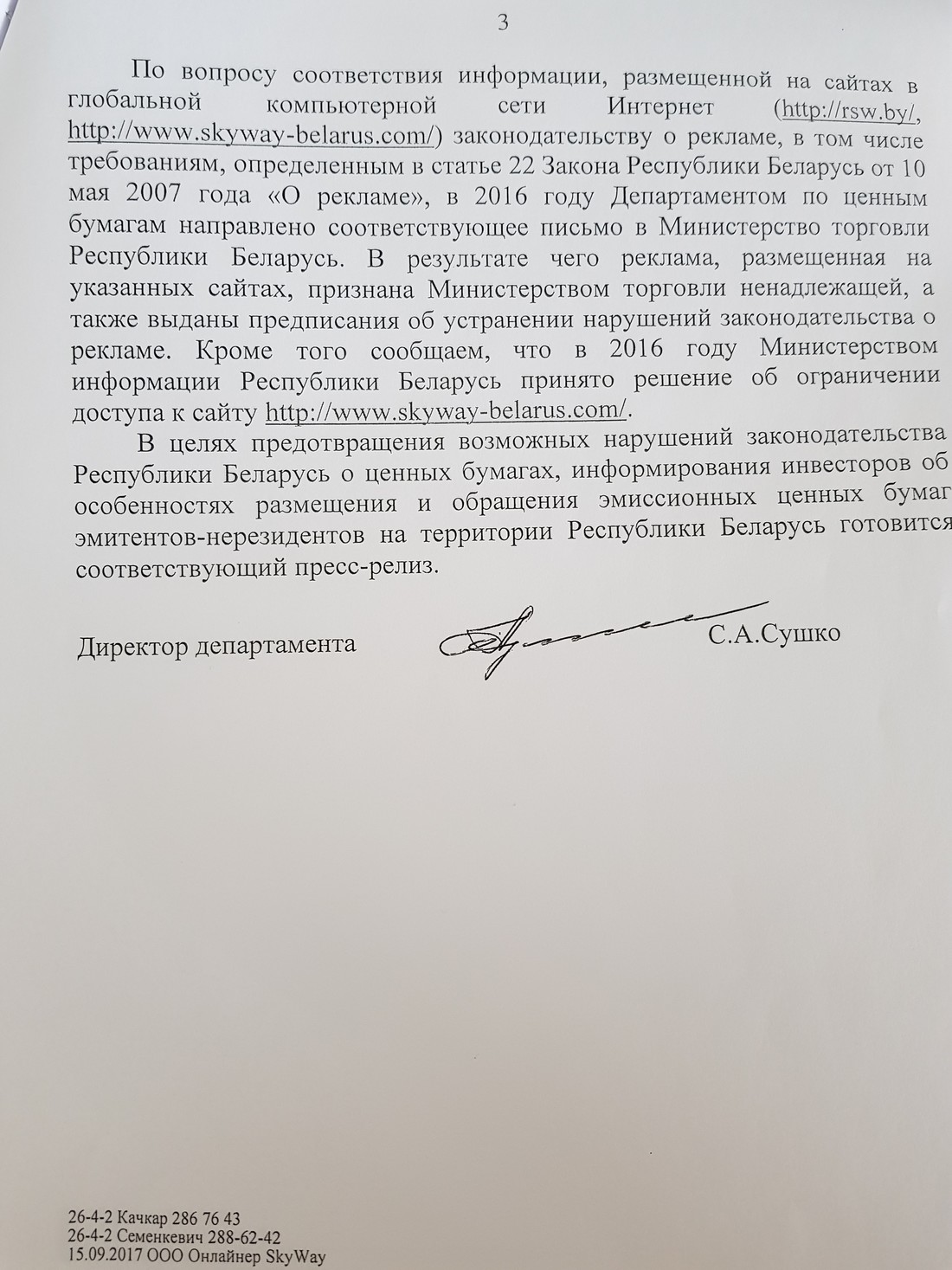 «По вопросу соответствия информации, размещенной на сайтах в глобальной компьютерной сети Интернет (http://rsw.by/, http://www.skyway-belarus.com/) законодательству о рекламе, в том числе требованиям, определенным в статье 22 Закона Республики Беларусь от 10 мая 2007 года „О рекламе“, в 2016 году Департаментом по ценным бумагам направлено соответствующее письмо в Министерство торговли Республики Беларусь. В результате чего реклама, размещенная на указанных сайтах, признана Министерством торговли ненадлежащей, а также выданы предписания об устранении нарушений законодательства о рекламе. Кроме того, сообщаем, что в 2016 году Министерством информации Республики Беларусь принято решение об ограничении доступа к сайту http://www.skyway-belarus.com/», — рассказали в ведомстве.