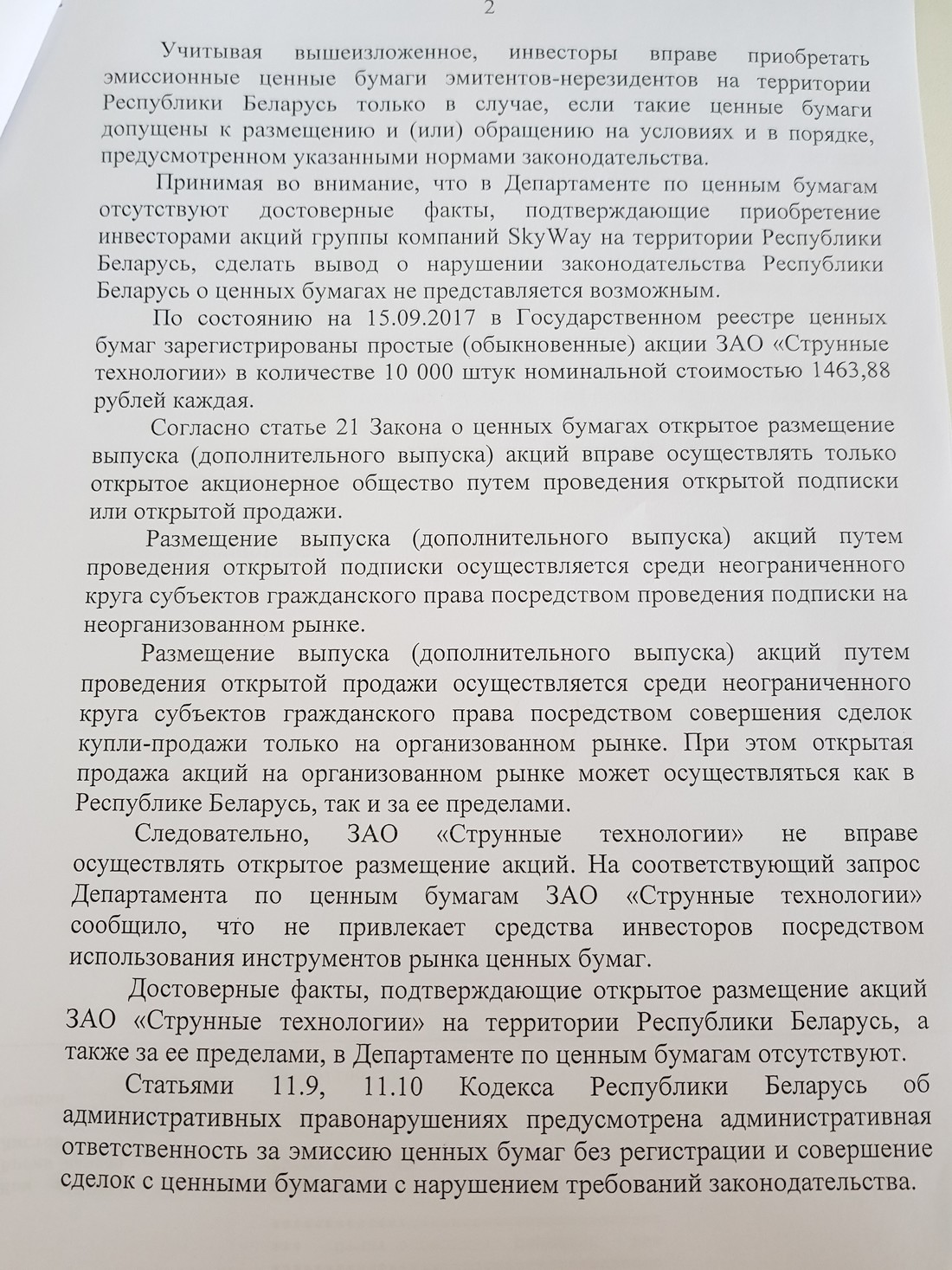 «По состоянию на 15.09.2017 акции группы компаний SkyWay к размещению и обращению на территории Республики Беларусь не допускались», — добавили в департаменте. Вместе с тем там отметили, что в Госреестре зарегистрированы простые (обыкновенные) акции ЗАО «Струнные технологии» в количестве 10 000 штук номинальной стоимостью 1463,88 рубля каждая. Осуществлять открытое размещение этих акций компания не может.