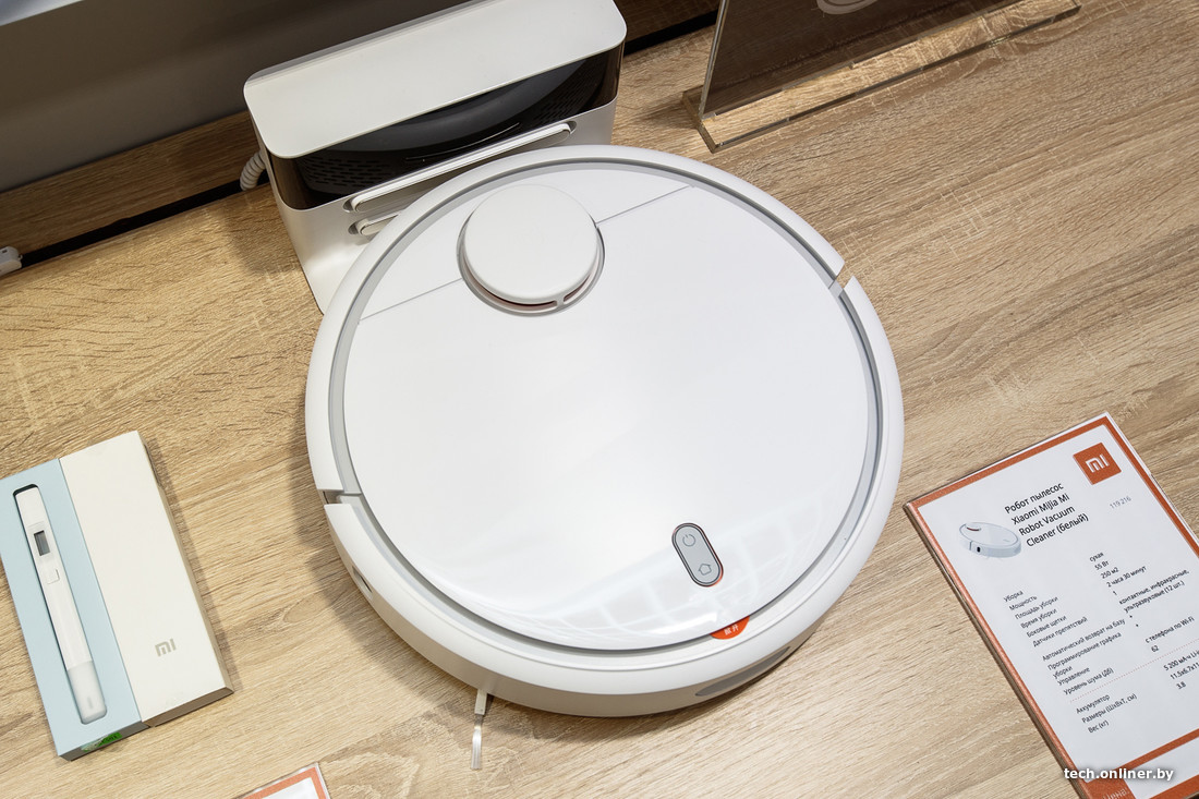 Когда мы навестили Mi.by, в магазине был представлен широкий ассортимент товаров, в том числе телевизоры и расходные материалы для разной домашней техники. Нам рассказали, что все это не выставочные образцы, а устройства, которые доступны для покупки. Правда, во время нашего визита шли последние приготовления к открытию, поэтому ценники были не на всех товарах. Для примера — робот-пылесос Xiaomi здесь оценили в тысячу рублей.
