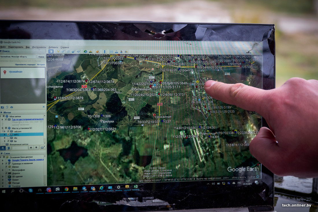 Вместе со специалистами компании «Байнет Телеком» мы отправились «в поля», чтобы на месте узнать, как выглядит процесс поиска источника интернета в отдалении от проторенных троп. А таких километрах в 15—20 от Минска немало. Алгоритм предельно простой: из аппаратуры требуется специальная направленная антенна (3G или LTE), прошитый для вывода технической информации модем для операторских SIM-карт, карта с расположением базовых станций и ноутбук с необходимым ПО. Промозглая погода, поля вокруг и пронизывающий ветер не позволяли расслабиться, поэтому процесс измерений шел быстро.
