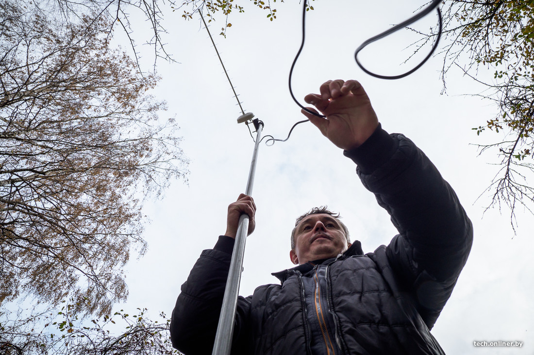 Первая остановка запланирована в Сенице, вдалеке от жилой застройки. Здесь скорость мобильного интернета составляет около 2 Мбит/с, и то если повезет. Сориентировавшись по карте Google Earth со слоями от BELNETMON в направлении ближайших базовых станций (цветовая индикация позволяет понять, кому из операторов они принадлежат), специалисты временно вооружились малярной штангой с закрепленной к ней антенной. «Она легкая и телескопическая — проще направлять и искать сигнал. После того как найдено оптимальное место, антенна крепится на кронштейн», — пояснили нам. Начался поиск БС для размещения антенны, чтобы добиться наиболее высоких показателей: вначале надо понять, имеет ли смысл использовать усилитель в принципе или все тлен.