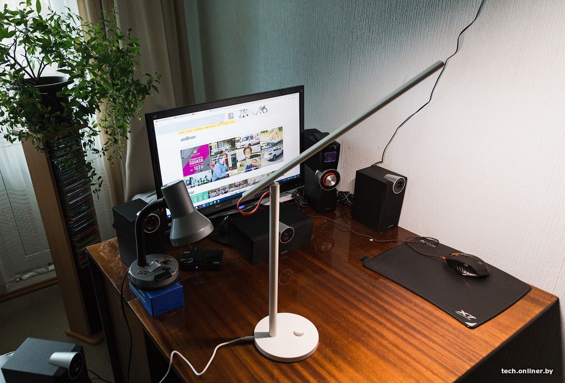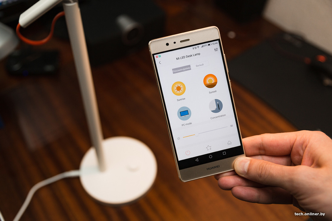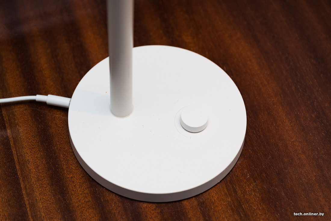 Настольный светильник чуть проще в плане возможностей, но обладает более изящным внешним видом. Для прямого взаимодействия с ним имеется кнопка/регулятор — включать лампу да регулировать свет (интенсивность и температуру). В пресетах есть варианты, адаптированные для «работы за компьютером», «чтения», «томного вечера» и так далее.