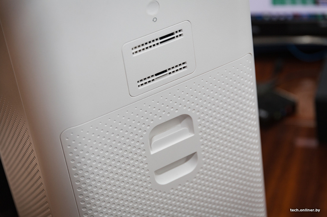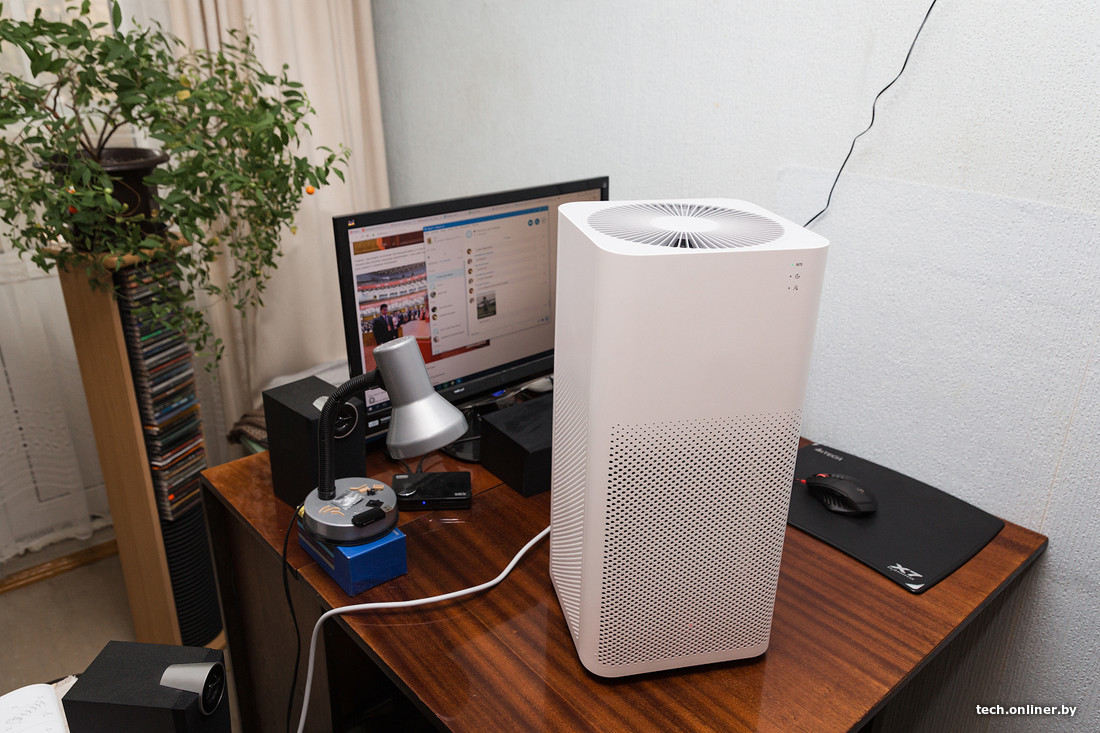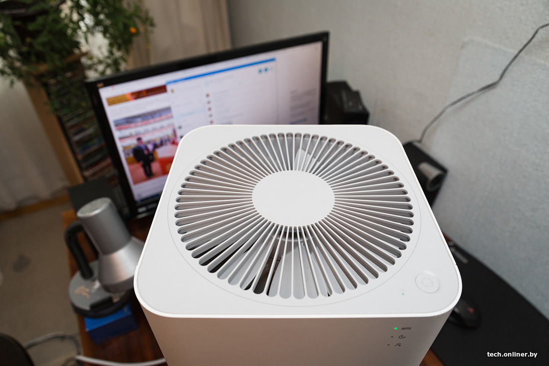 Одним из наиболее крупных образцов в нашей «коллекции» стал очиститель воздуха Mi Purifier 2. Это колонна с прямоугольным сечением и все тем же минималистичным дизайном. За очистку воздуха отвечают внушительных размеров сменный цилиндрический фильтр да вентилятор в верхней части. В нижней половине по периметру имеется перфорация для обмена воздухом. Фильтр меняется просто, однако обойдется он в копеечку. Впрочем, в небольшой квартире его хватит надолго — все зависит от степени загрязнения (в центре города, вероятно, фильтр «забьется» быстрее).